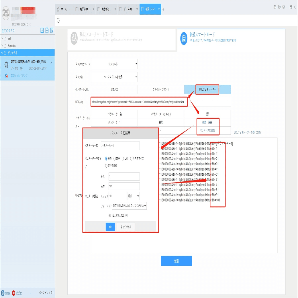 URLジェネレータでURLを入力して、パラメーターを追加画面にページ数を入力します。今回は1から101まで、ステップは10に設定してください。生成したURLはプレビュー画面でチェックしてください。