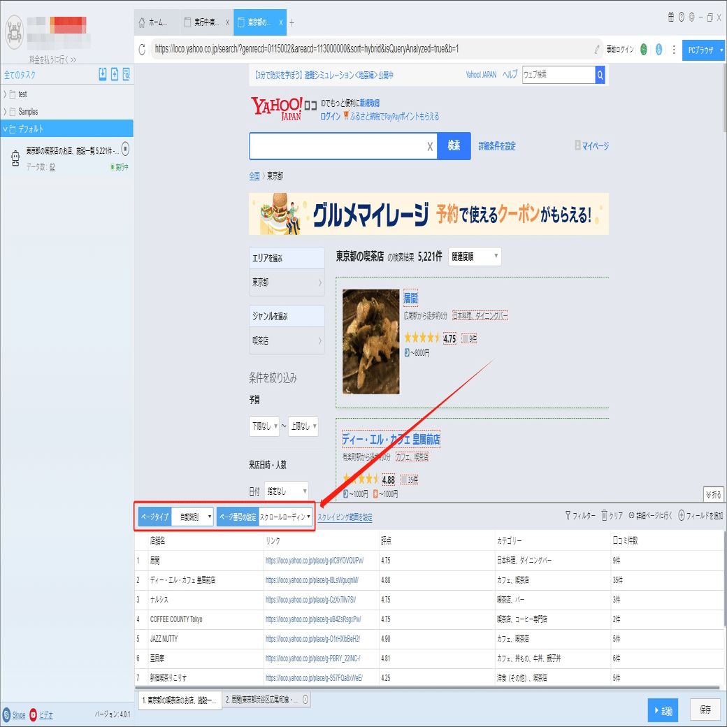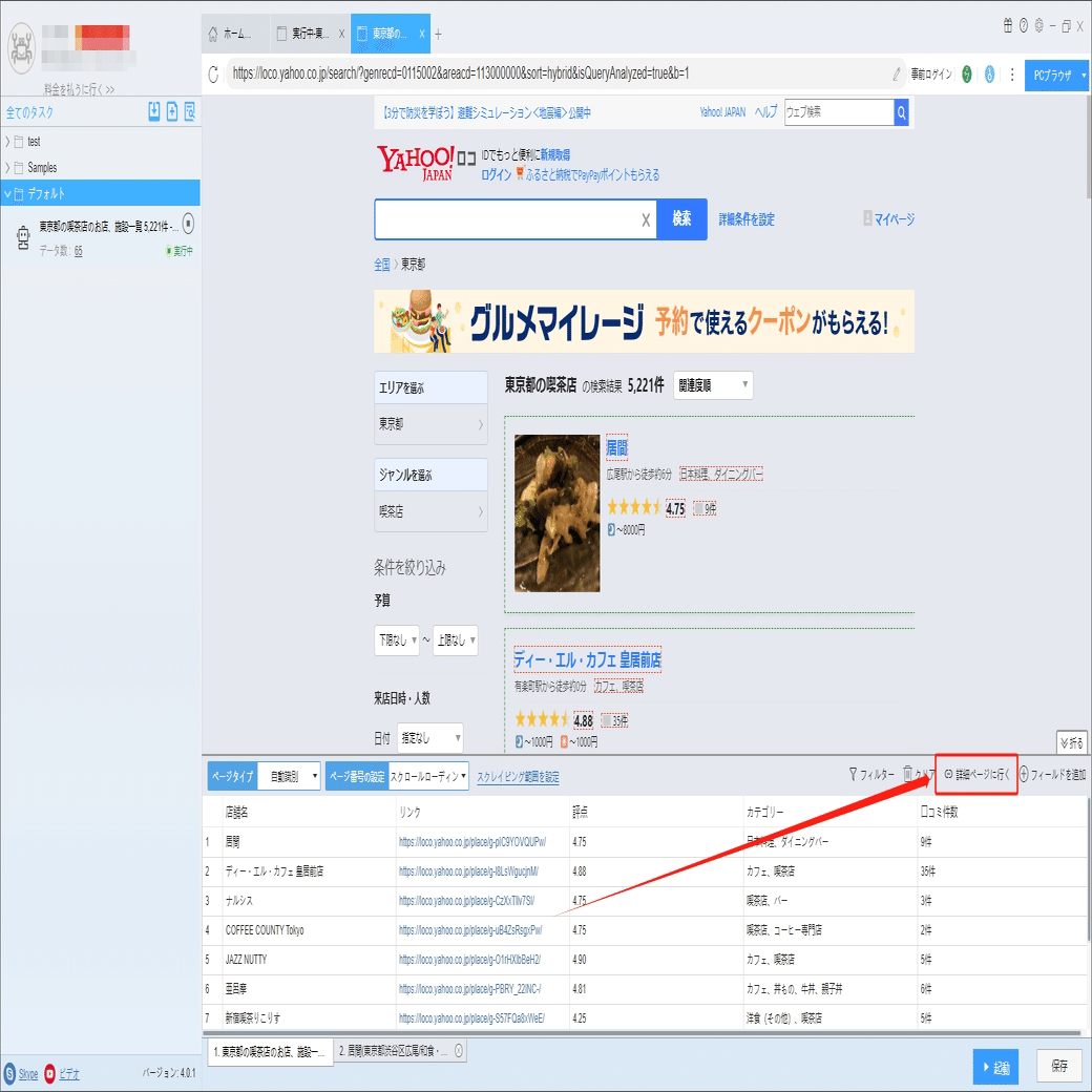 アクセス、電話番号、住所などの情報は詳細ページに付いていますから、ソフトウェアの「詳細ページに行く」機能を利用して、データを抽出します。