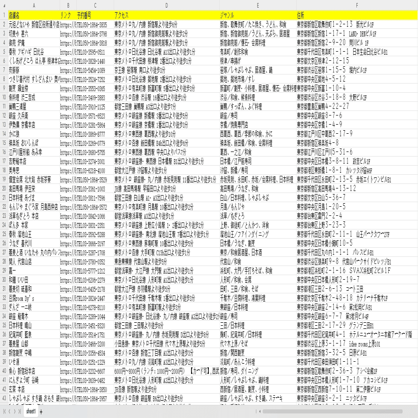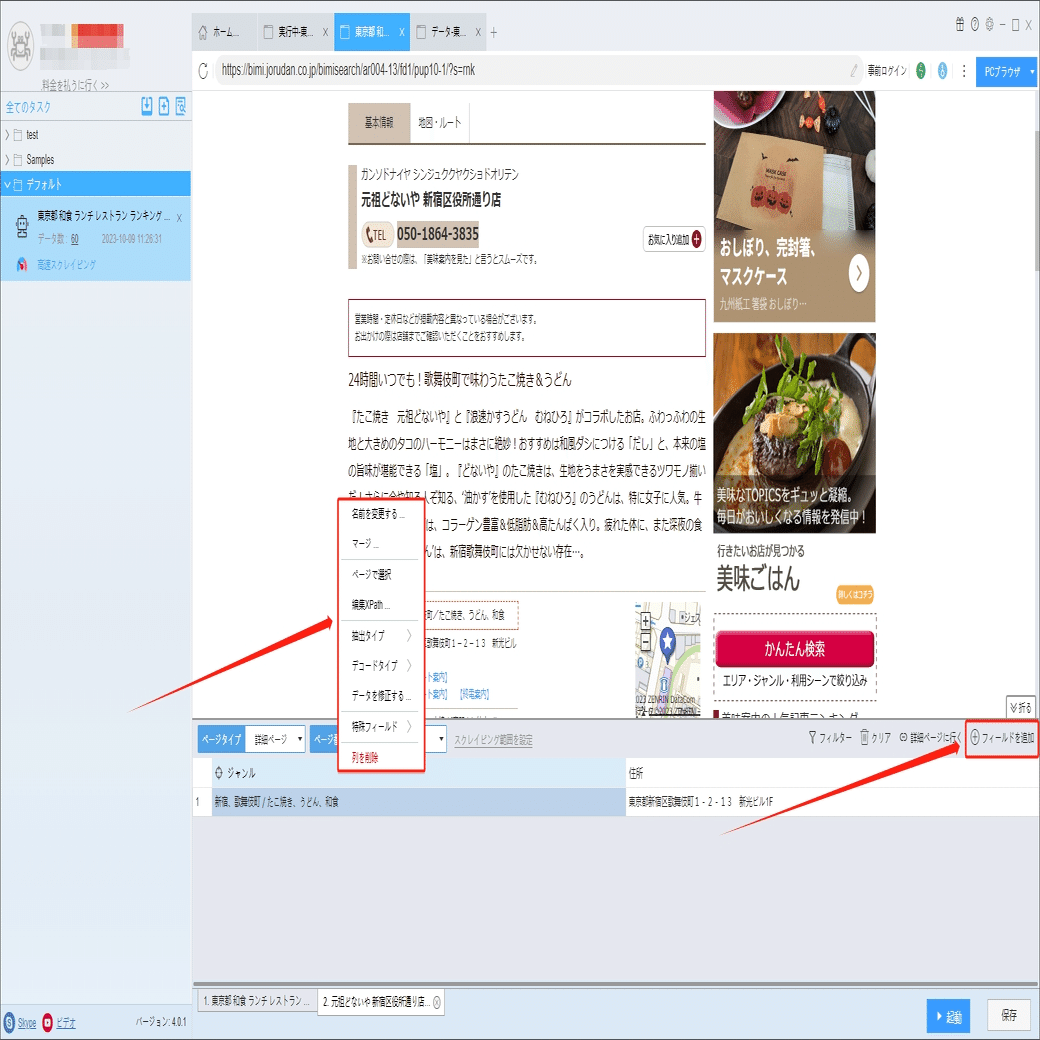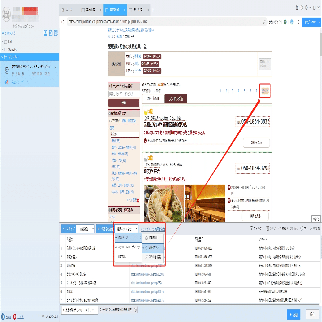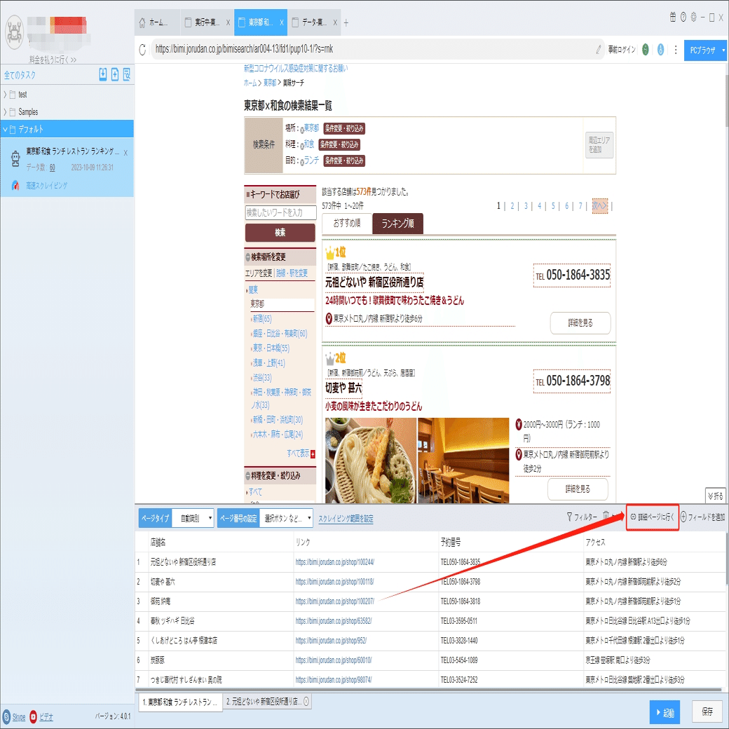 アクセス、住所などの情報は詳細ページに付いていますから、ソフトウェアの「詳細ページに行く」機能を利用して、データを抽出します。