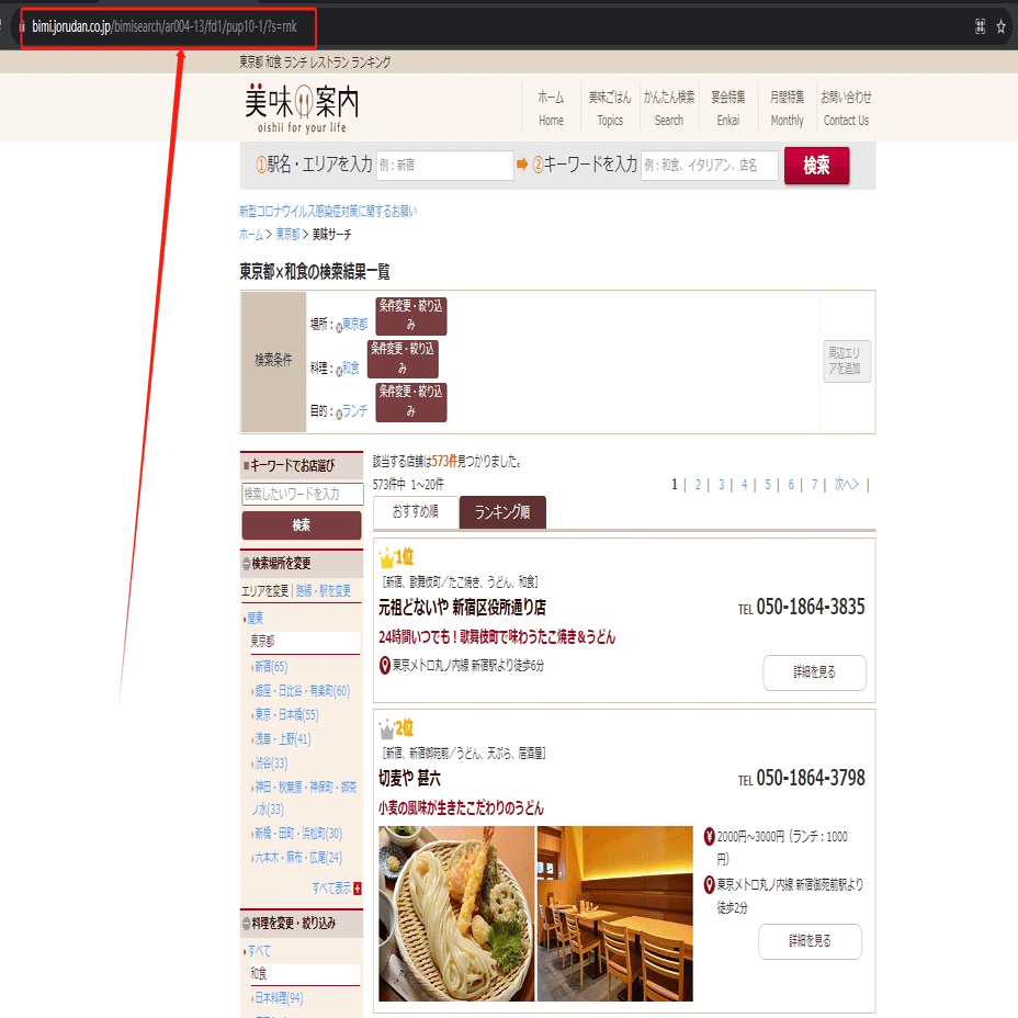 今回は東京都和食の検索結果をランキング順にして、その検索結果一覧ページのスクレイピング方法を紹介します。まず、URLをコピーしてください。