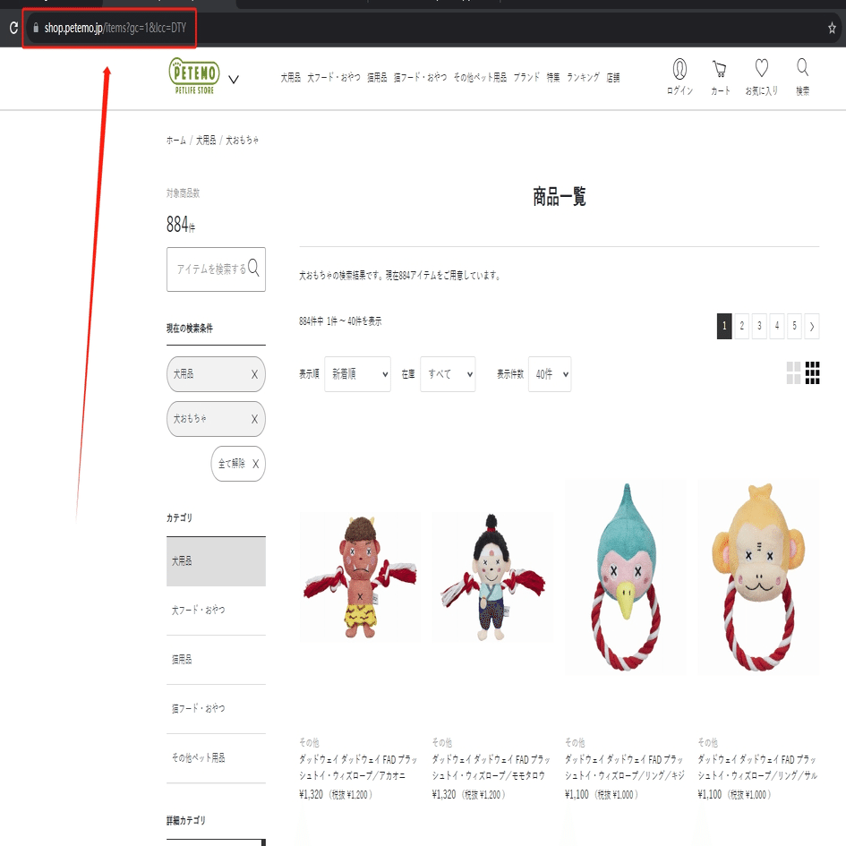 今回は犬おもちゃの検索結果一覧ページのスクレイピング方法を紹介します。まず、URLをコピーしてください。