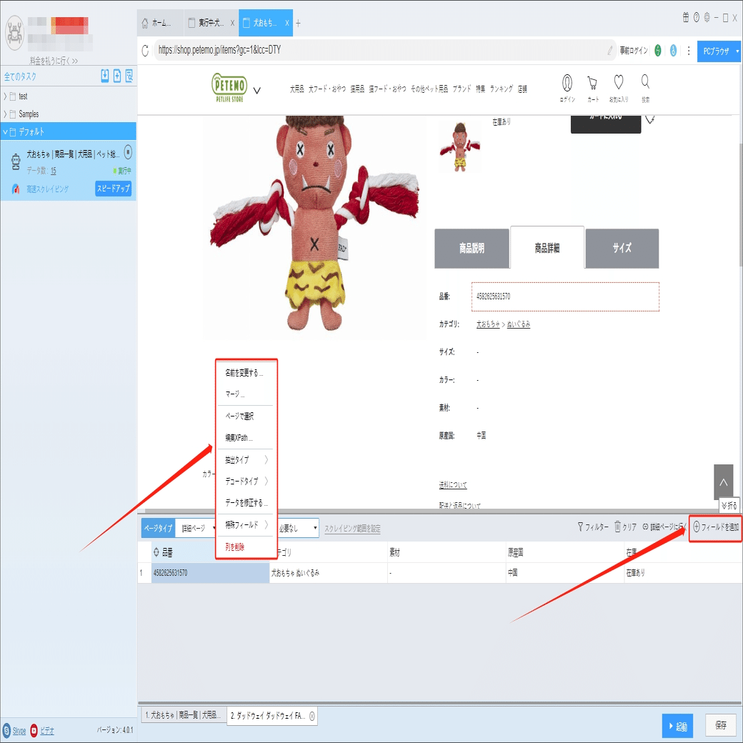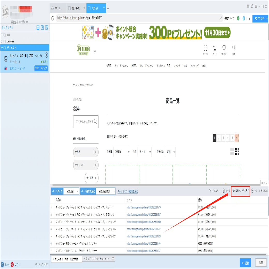 品番、在庫、原産国などの情報は詳細ページに付いていますから、ソフトウェアの「詳細ページに行く」機能を利用して、データを抽出します。