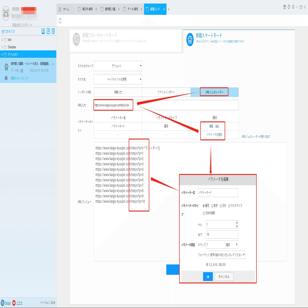 URLジェネレータでURLを入力して、パラメーターを追加画面にページ数を入力します。今回は1から10まで、ステップは1に設定してください。生成したURLはプレビュー画面でチェックしてください。