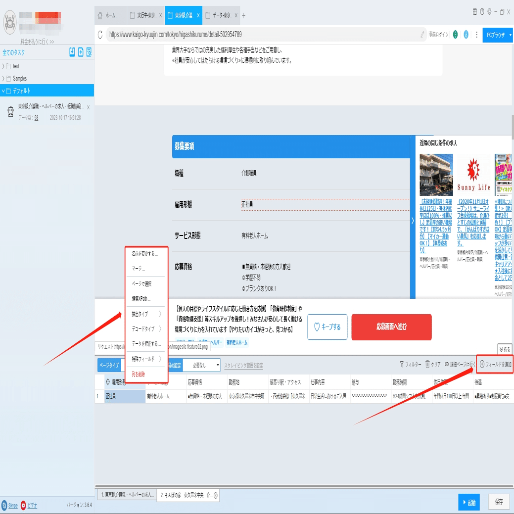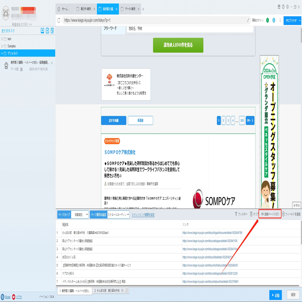 雇用形態、勤務地、勤務時間などは詳細ページに付いていますから、ソフトウェアの「詳細ページに行く」機能を利用して、データを抽出します。