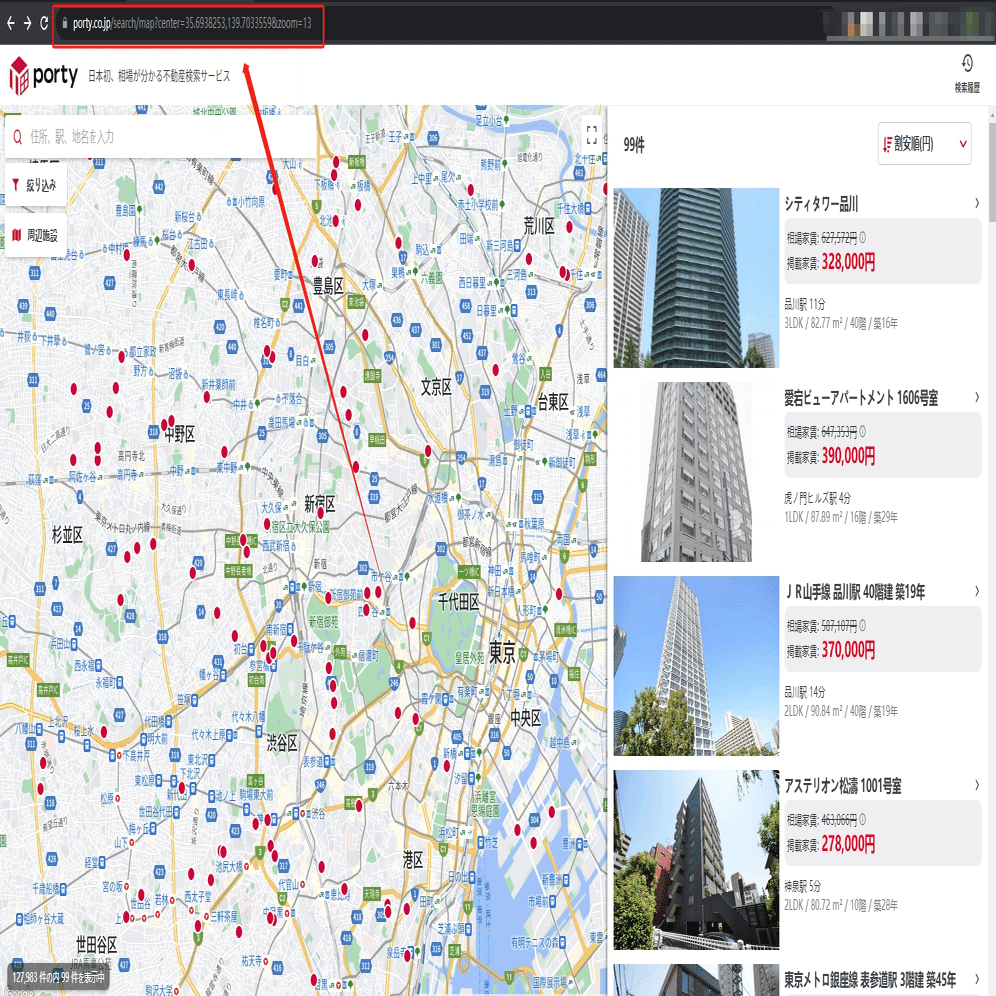 今回は新宿の物件一覧ページのスクレイピング方法を紹介します。まず、URLをコピーしてください。