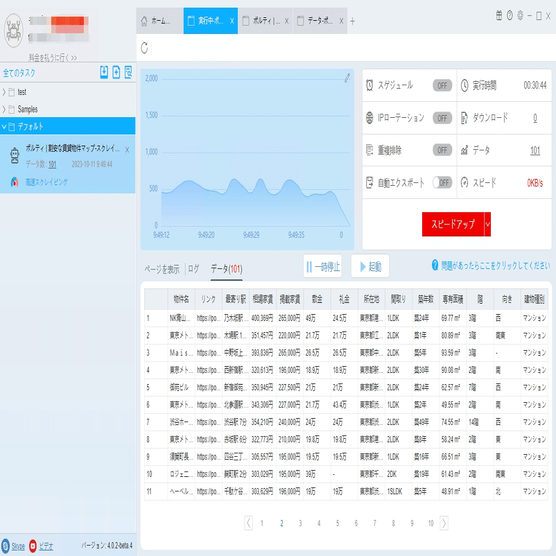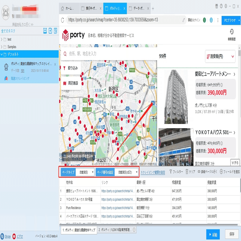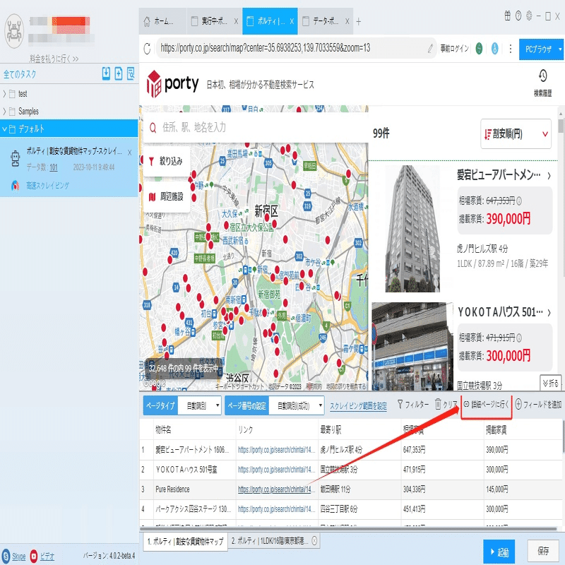 間取、築年数、専有面積などの情報は詳細ページに付いていますから、ソフトウェアの「詳細ページに行く」機能を利用して、データを抽出します。