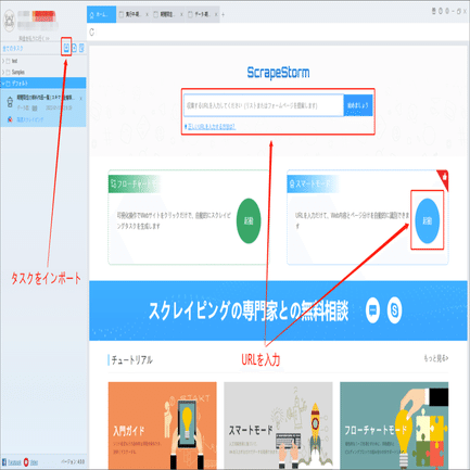 ScrapeStormのホムページ画面にスマートモードタスクを新規作成します。また、持っているタスクをインポートすることもできます。