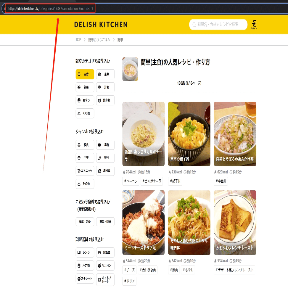 今回は簡単(主食)の人気レシピ・作り方一覧ページのスクレイピング方法を紹介します。まず、URLをコピーしてください。