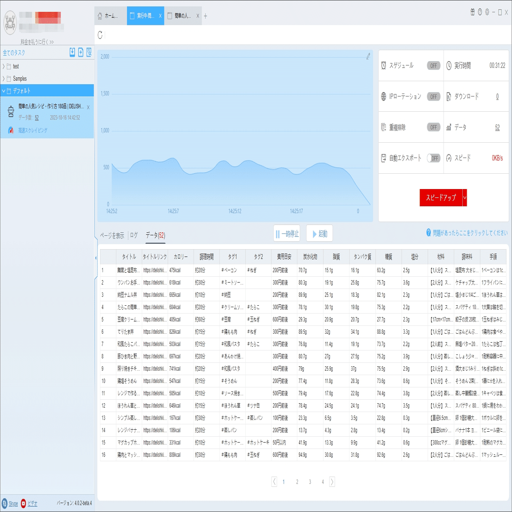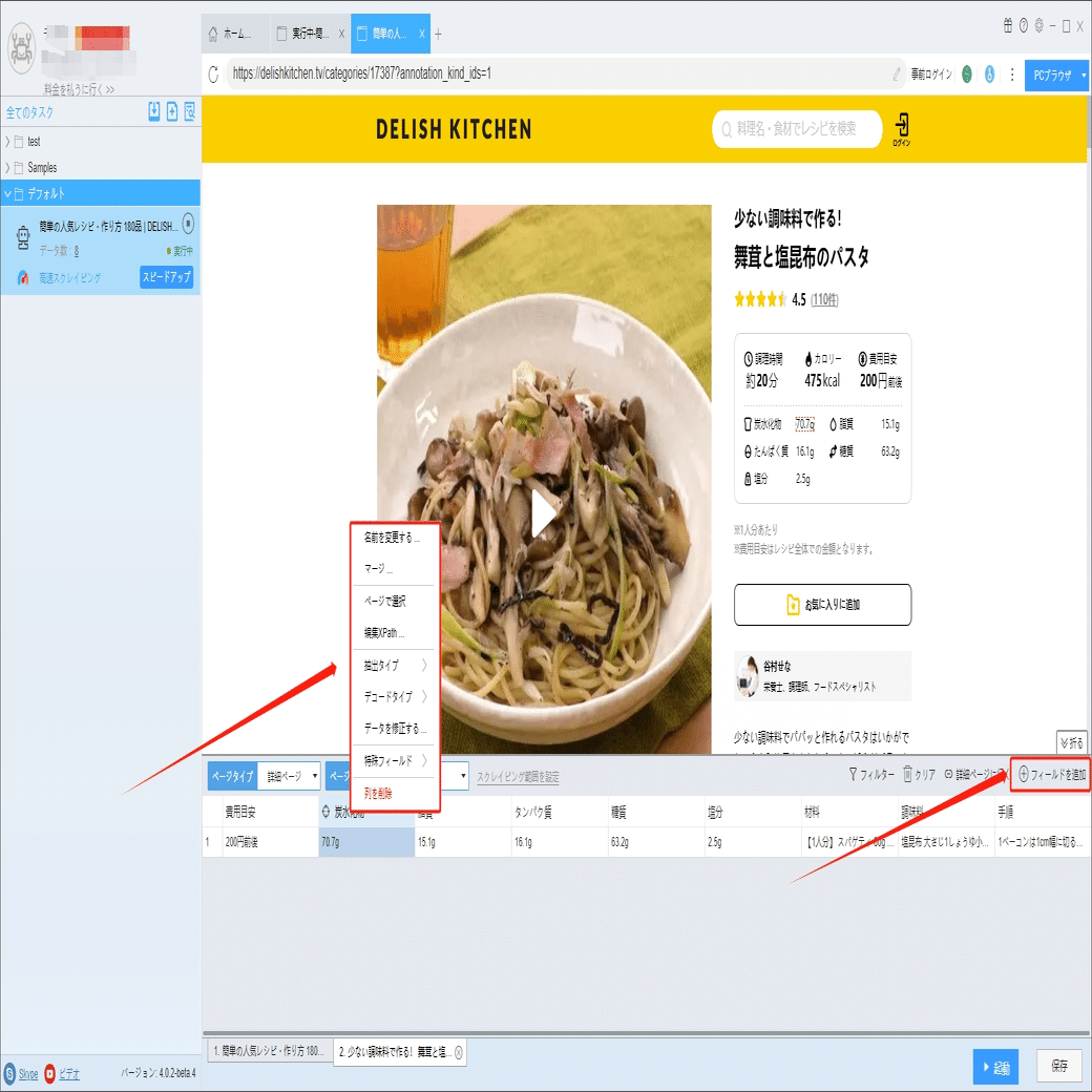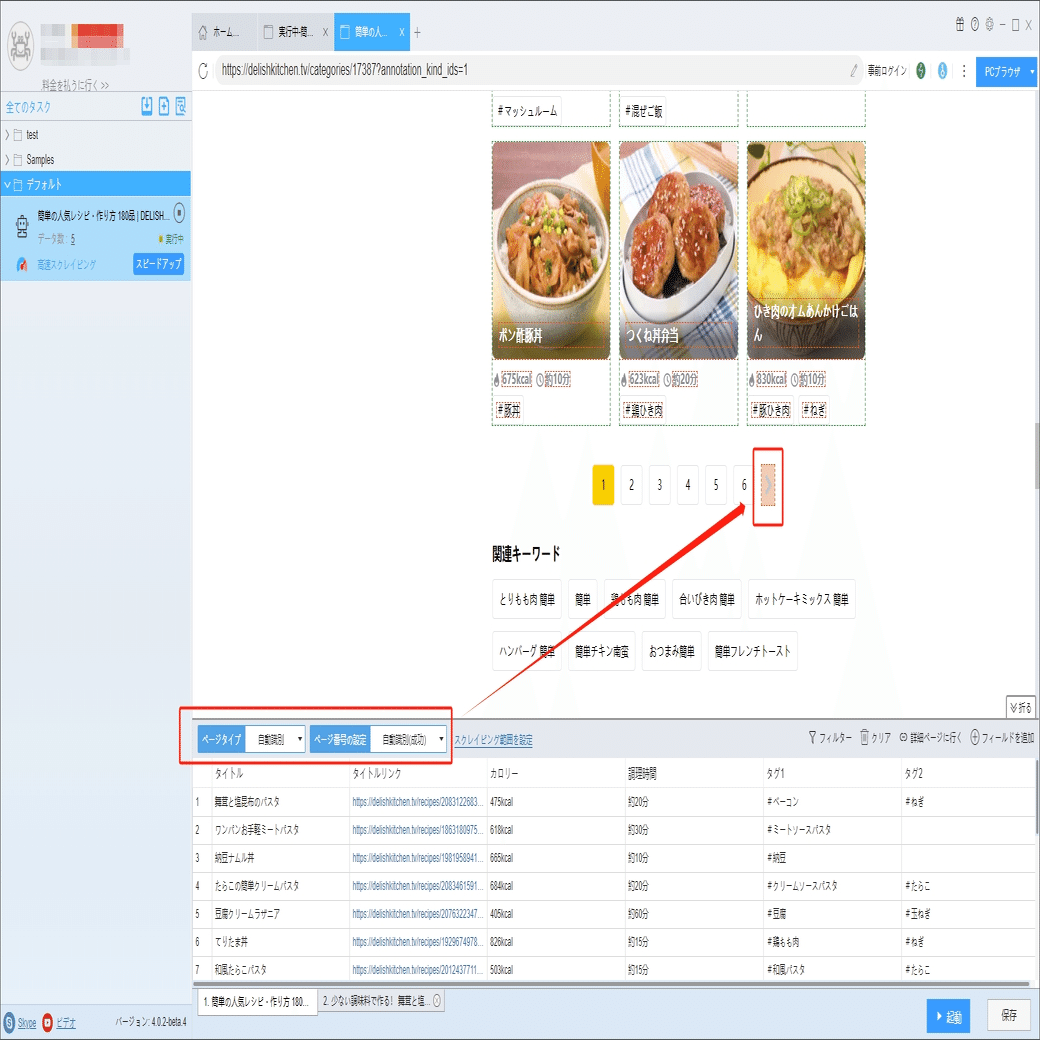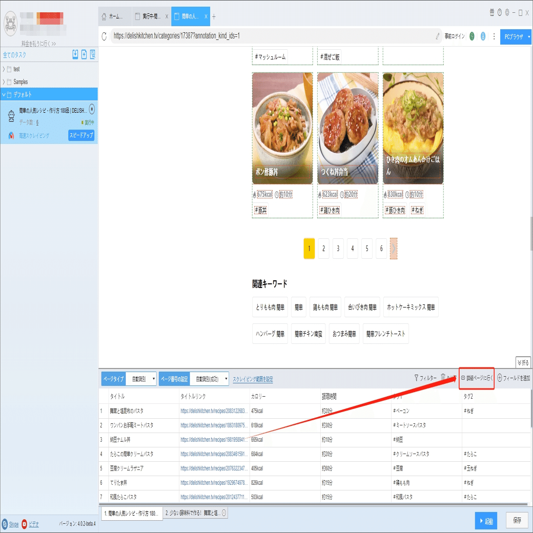 炭水化物、タンパク質、材料、調味料などの詳細情報は詳細ページに付いていますから、ソフトウェアの「詳細ページに行く」機能を利用して、データを抽出します。