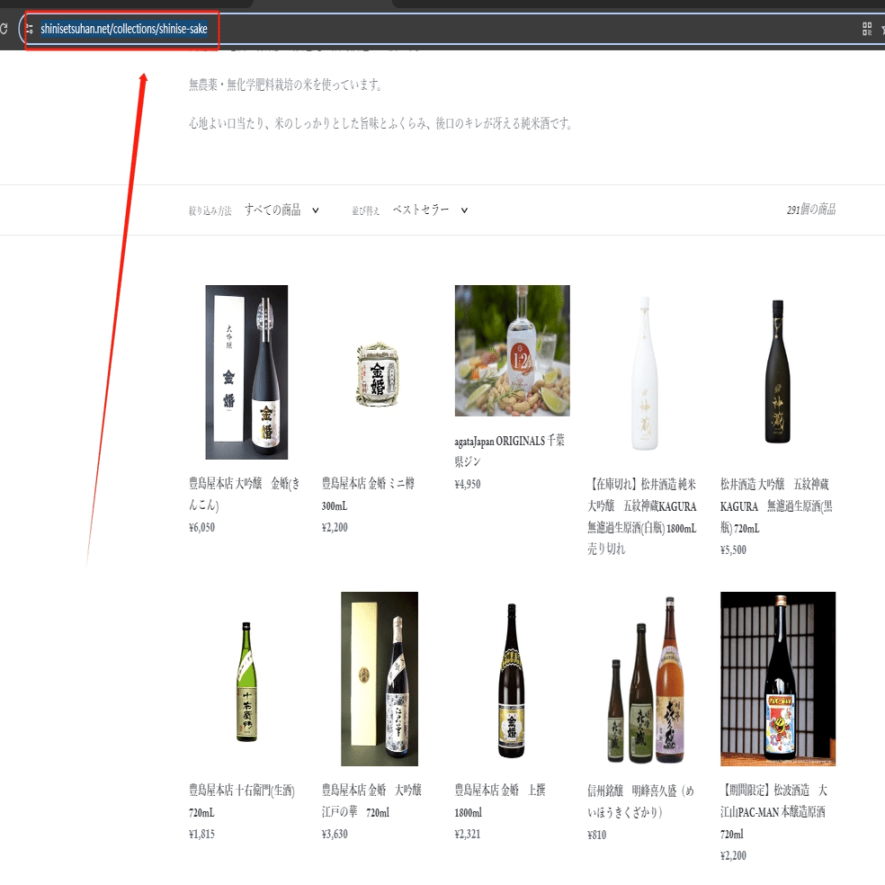 今回は老舗のお酒の検索結果ページを例として、スクレイピング方法を紹介します。まず、URLをコピーしてください。