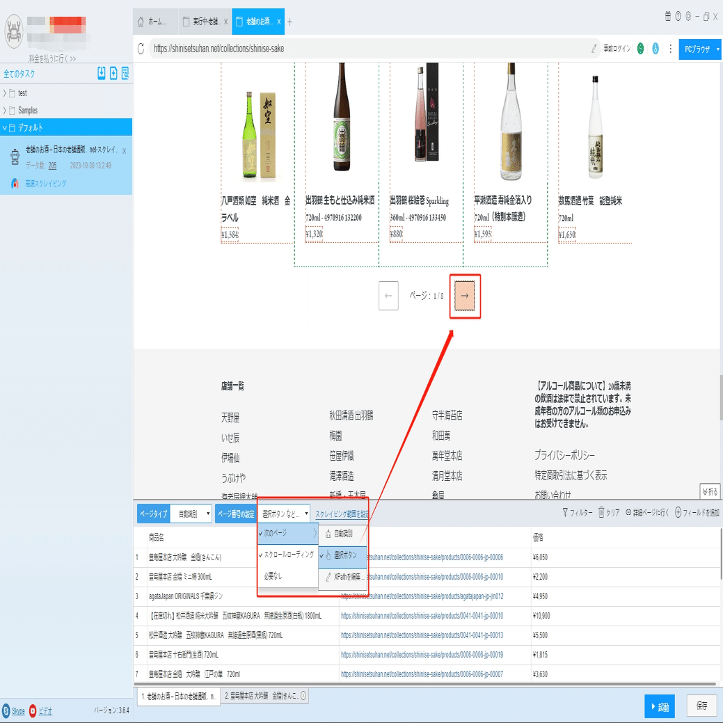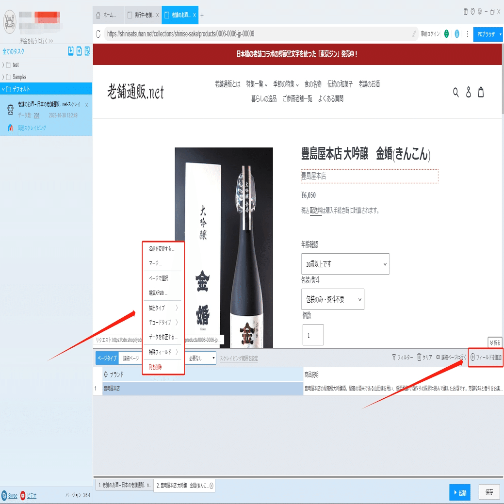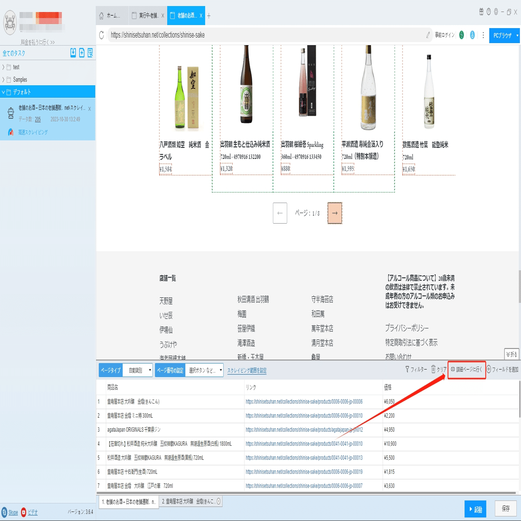 「詳細ページに行く」ボタンをクリックして、商品の詳細情報ページに移動します。商品説明などの情報を抽出できます。