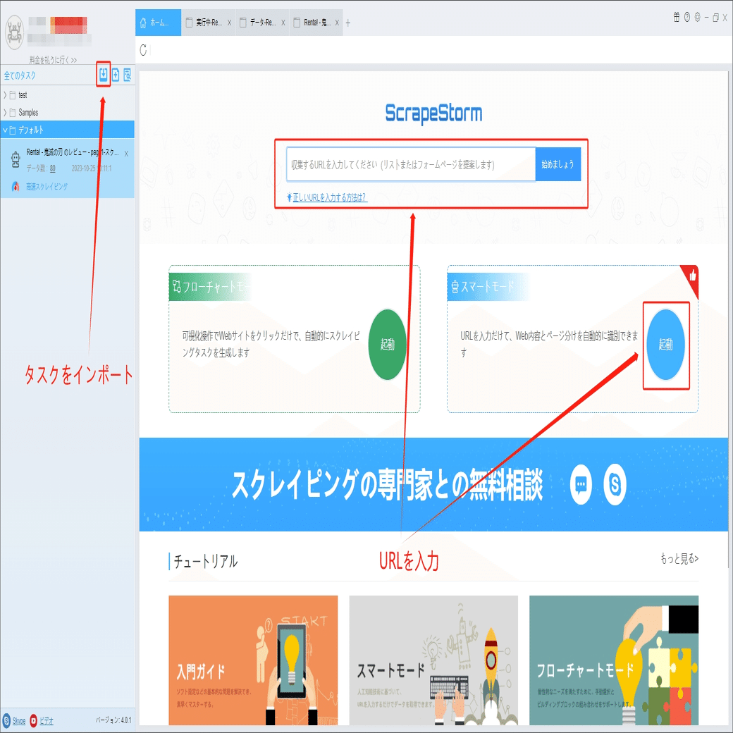 ScrapeStormのホムページ画面にスマートモードタスクを新規作成します。また、持っているタスクをインポートすることもできます。