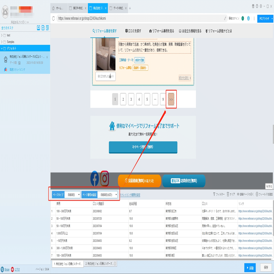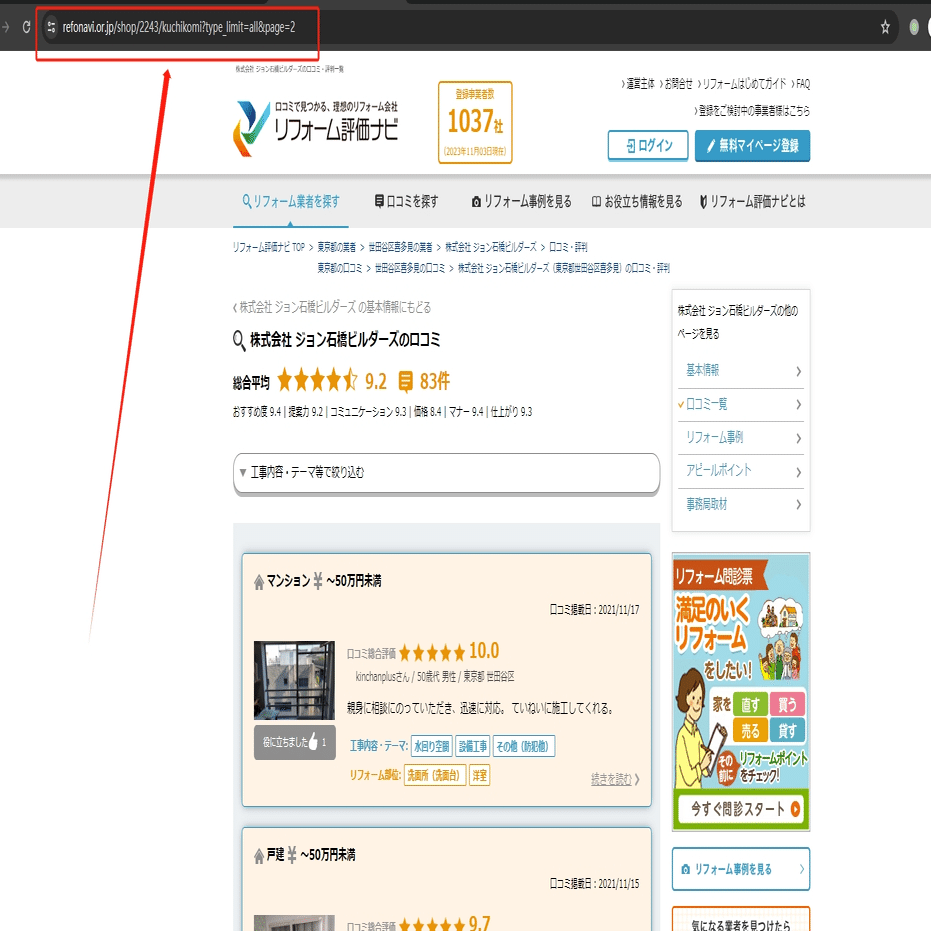 今回はある人気があるリフォーム会社のレビューページを例として、スクレイピング方法を紹介します。まず、URLをコピーしてください。