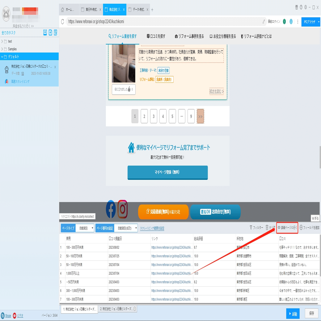 「詳細ページに行く」ボタンをクリックして、レビューページに移動し、クチコミ全文を抽出できます。