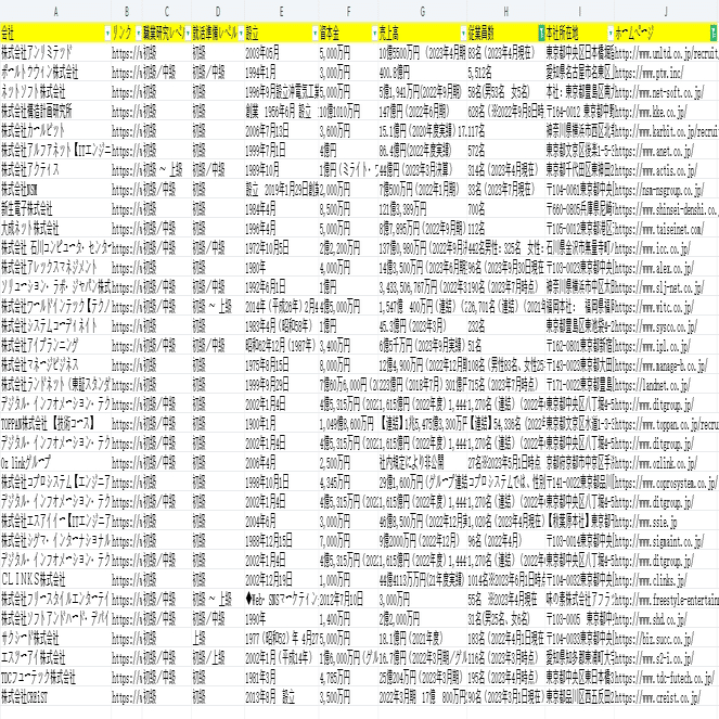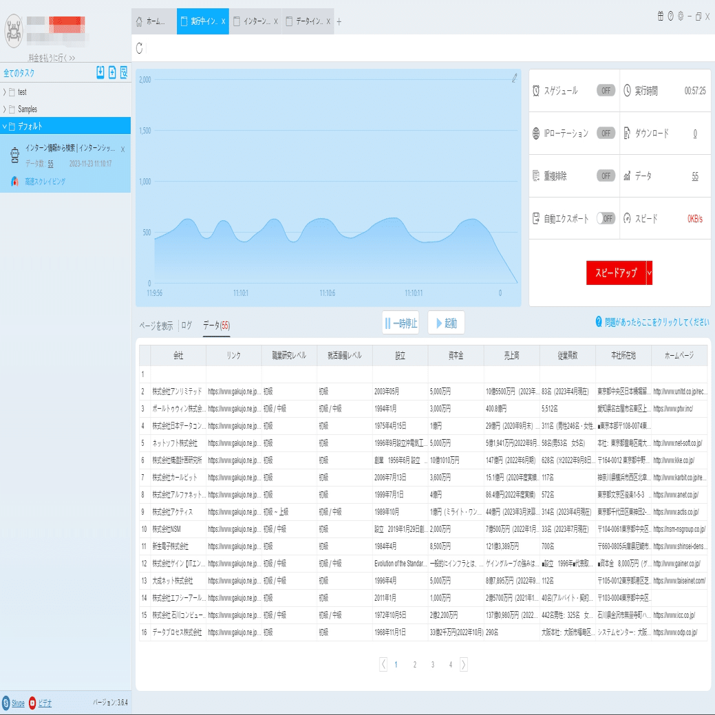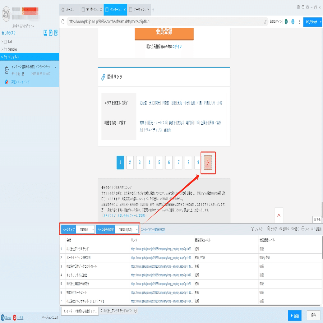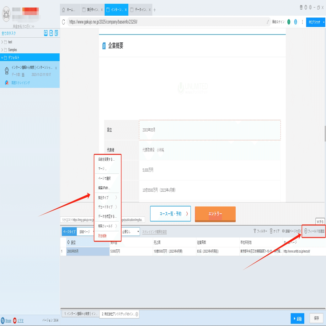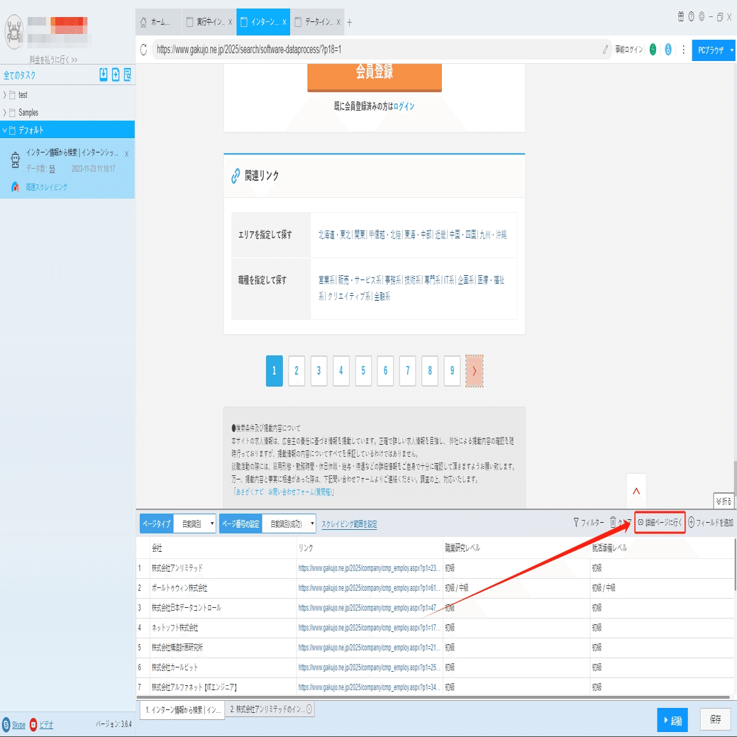 ソフトウェアの「詳細ページに行く」機能を利用して、ホームページ、設立年月などのデータを抽出します。