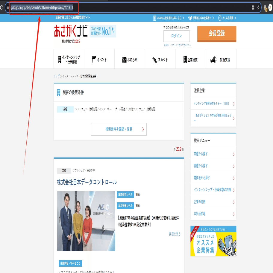 今回はインターンシップ・仕事体験開催企業をキーワードとして、その検索結果ページのスクレイピング方法を紹介します。まず、URLをコピーしてください。