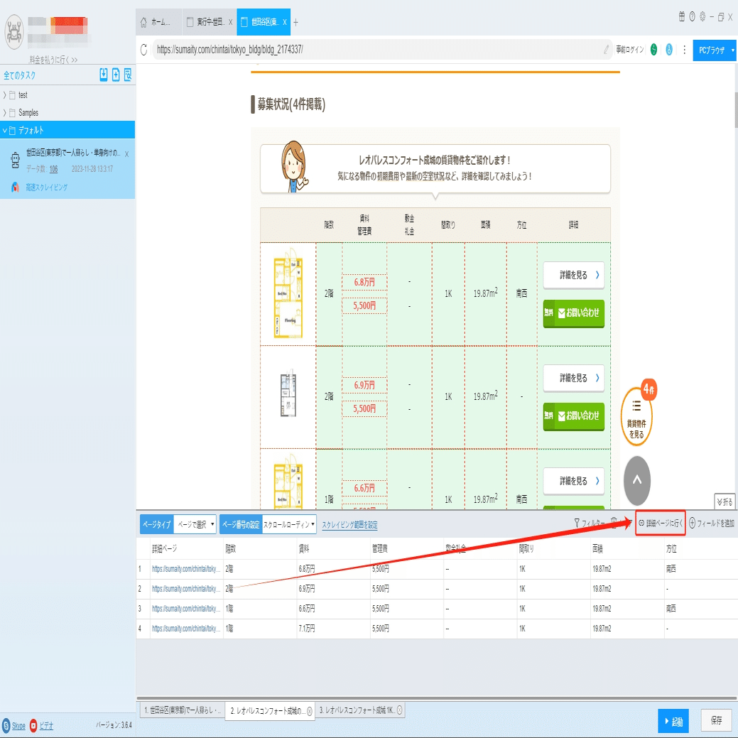 ソフトウェアの「詳細ページに行く」機能を利用し、掲載している物件の情報を抽出します。
