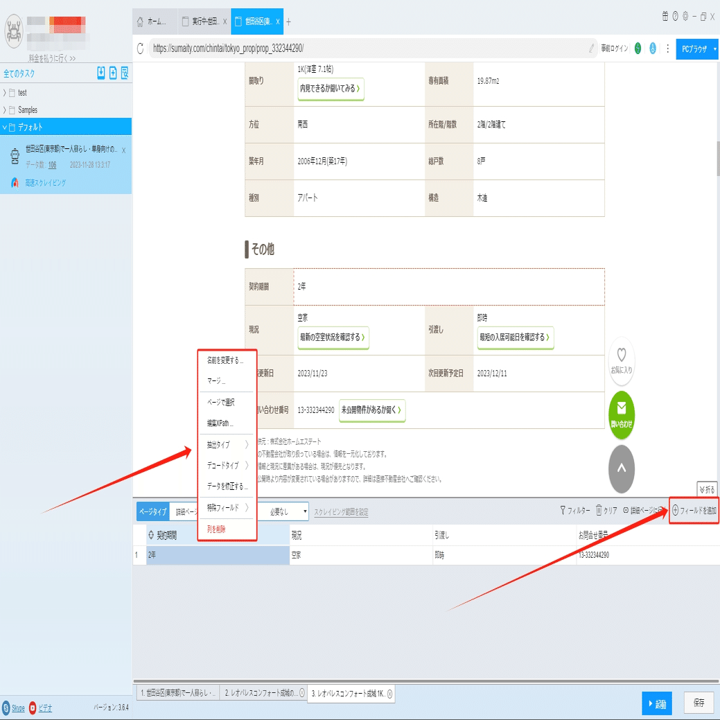 詳細ページを開くと、ソフトウェアはデフォルト「詳細ページモード」になり、手動でリスト要素を選択し、掲載している物件リストを識別できます。