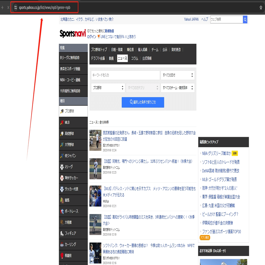 今回はプロ野球の関するニュース一覧ページを例として、スクレイピング方法を紹介します。まず、URLをコピーしてください。