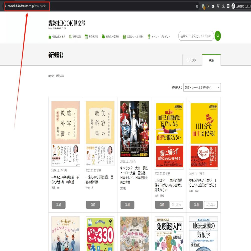 今回は新刊書籍ページを例として、スクレイピング方法を紹介します。まず、URLをコピーしてください。