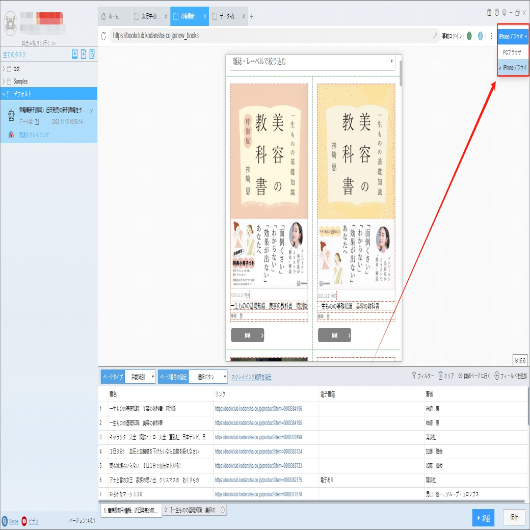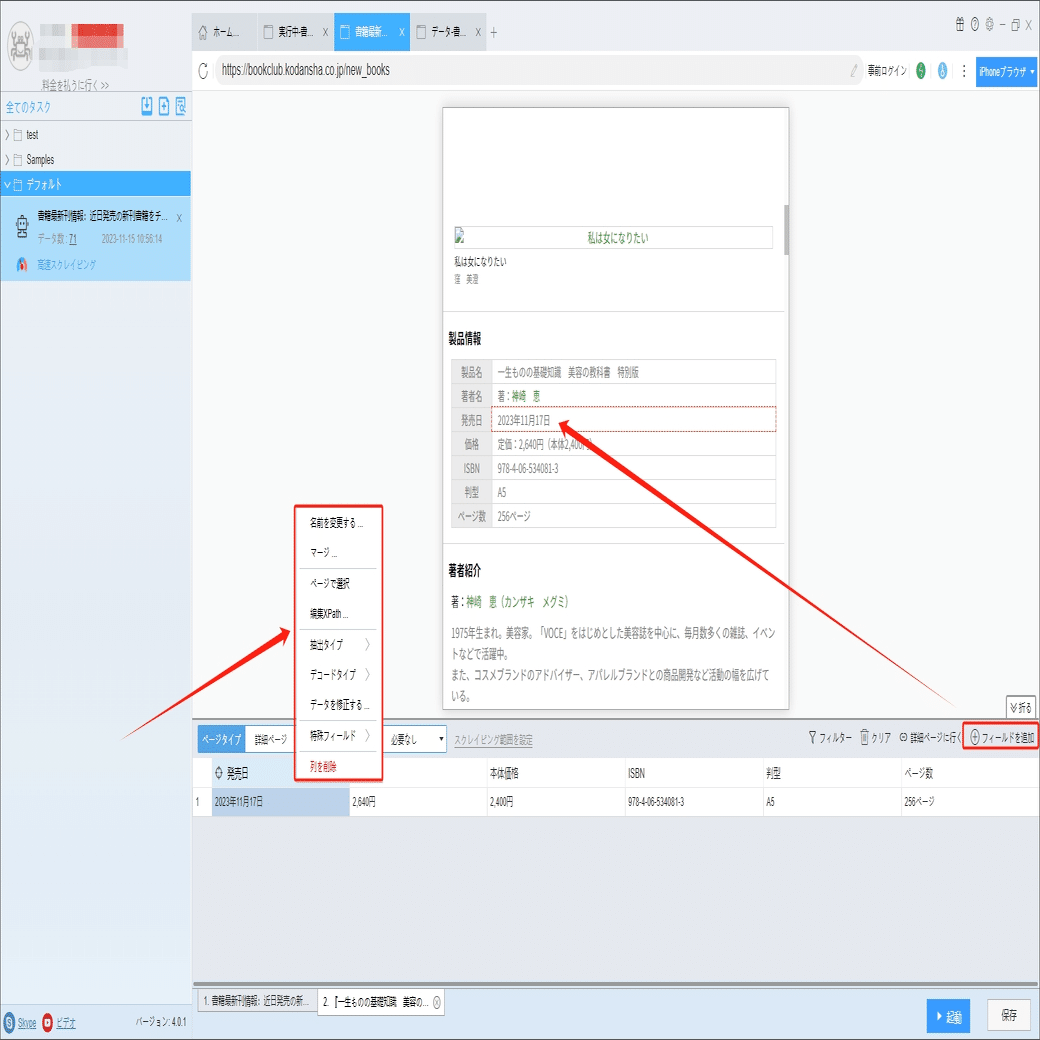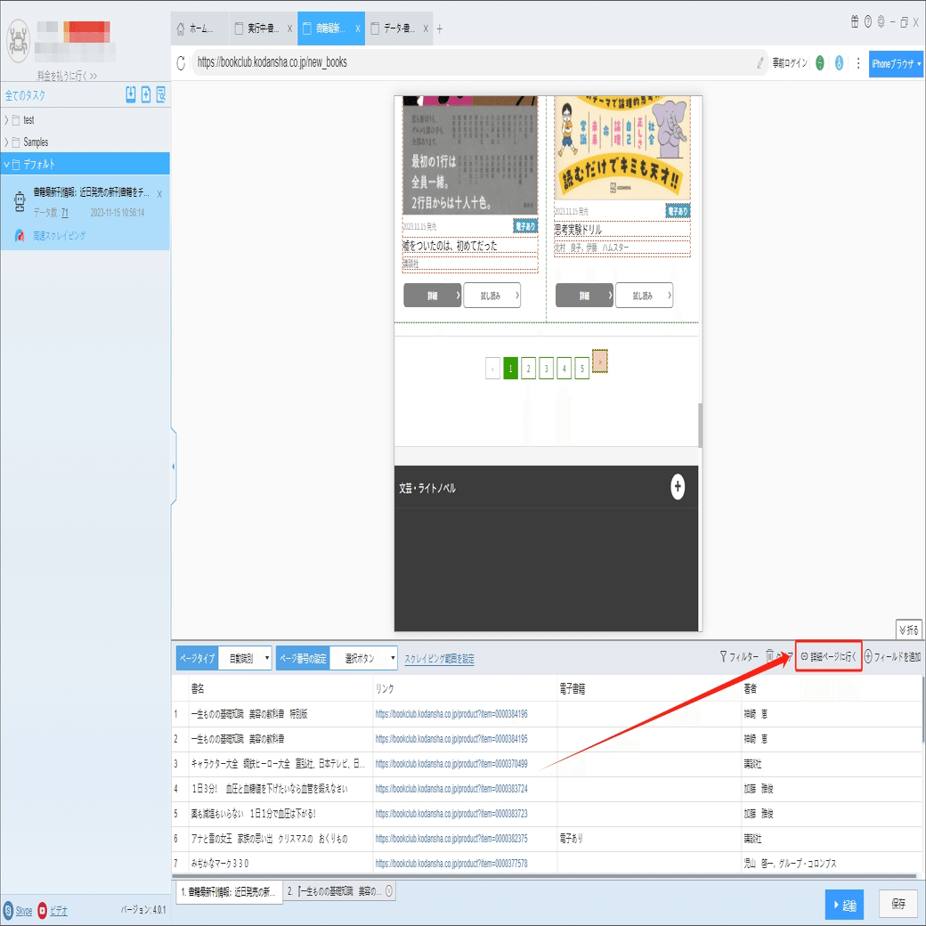 ソフトウェアの「詳細ページに行く」機能を利用して、ISBN、定価、ページ数などのデータを抽出します。