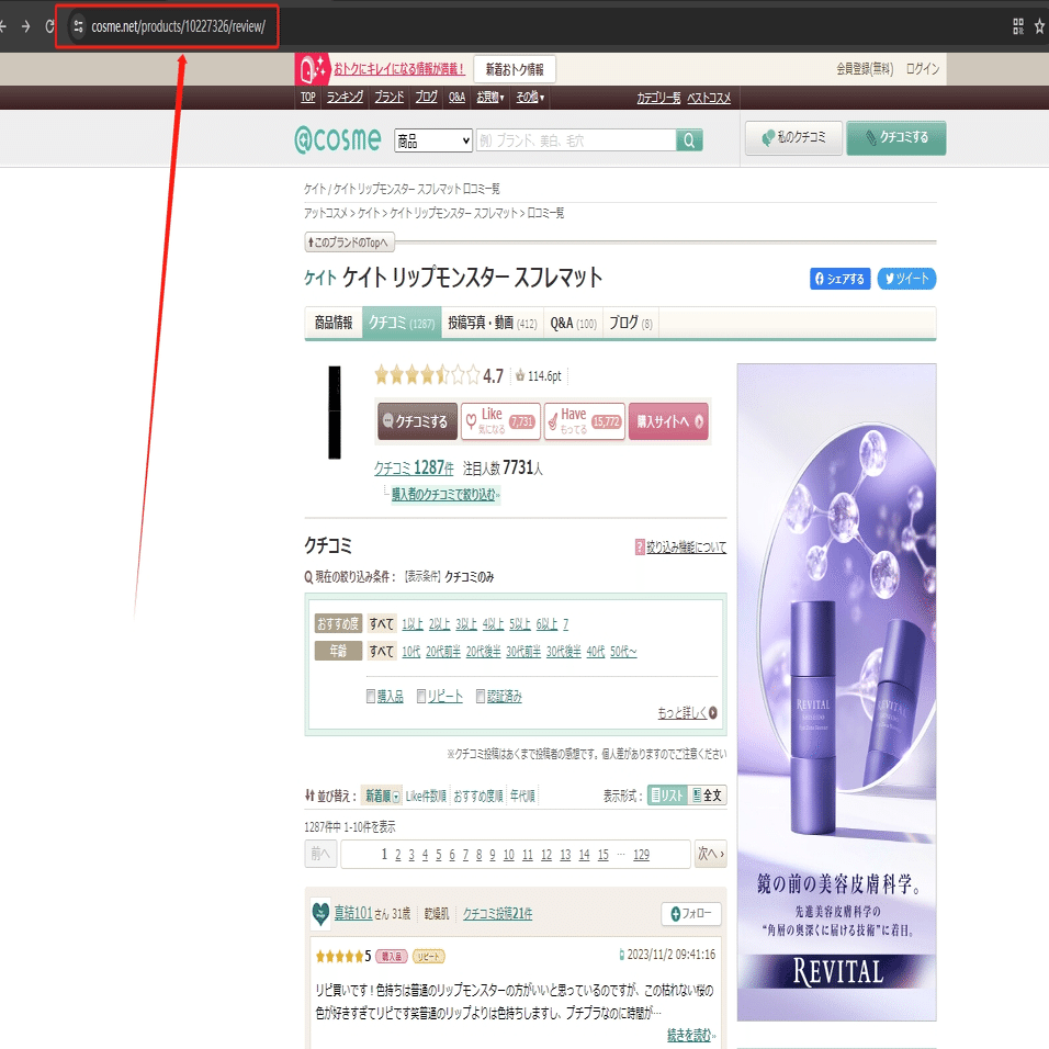 今回はある人気コスメのレビューページを例として、スクレイピング方法を紹介します。まず、URLをコピーしてください。