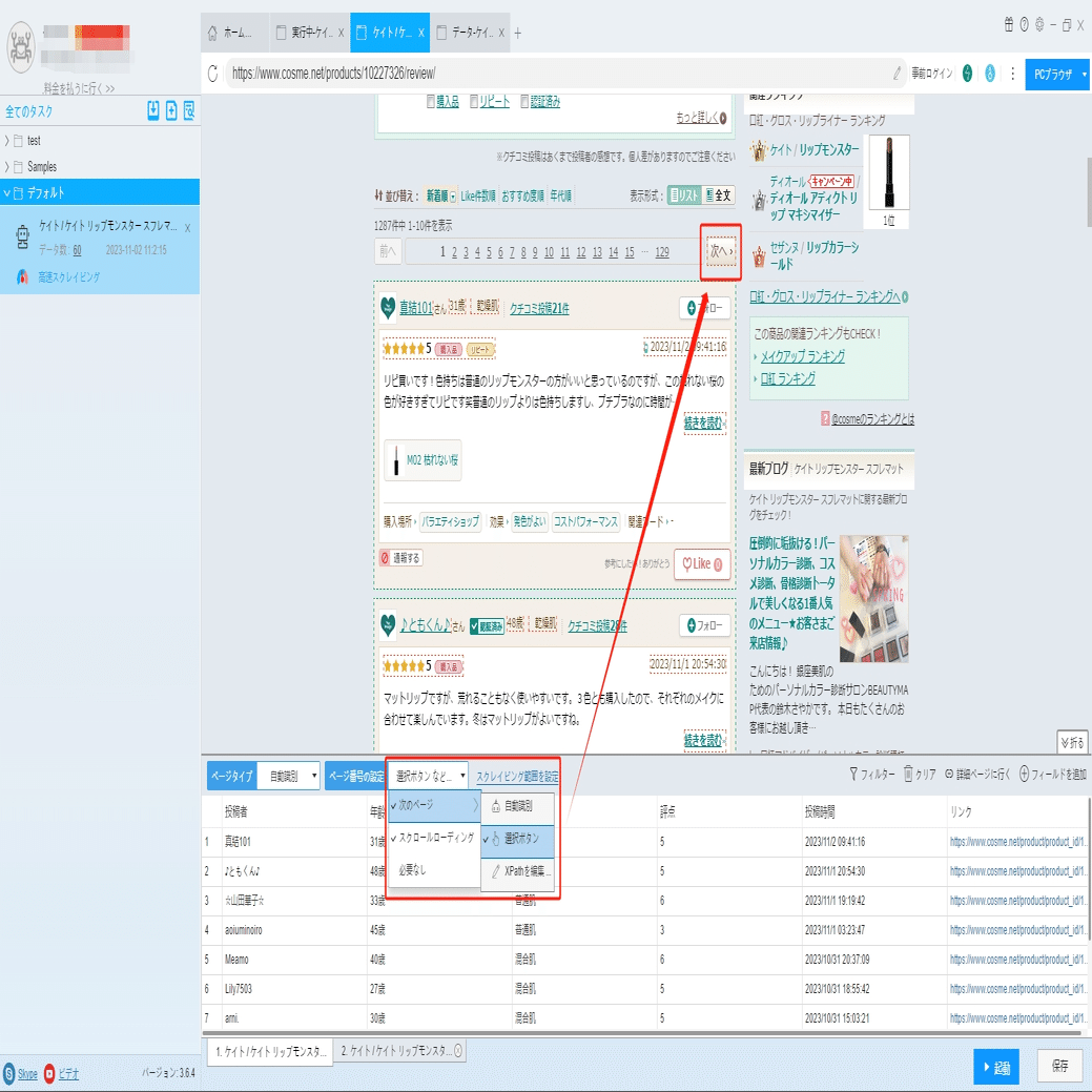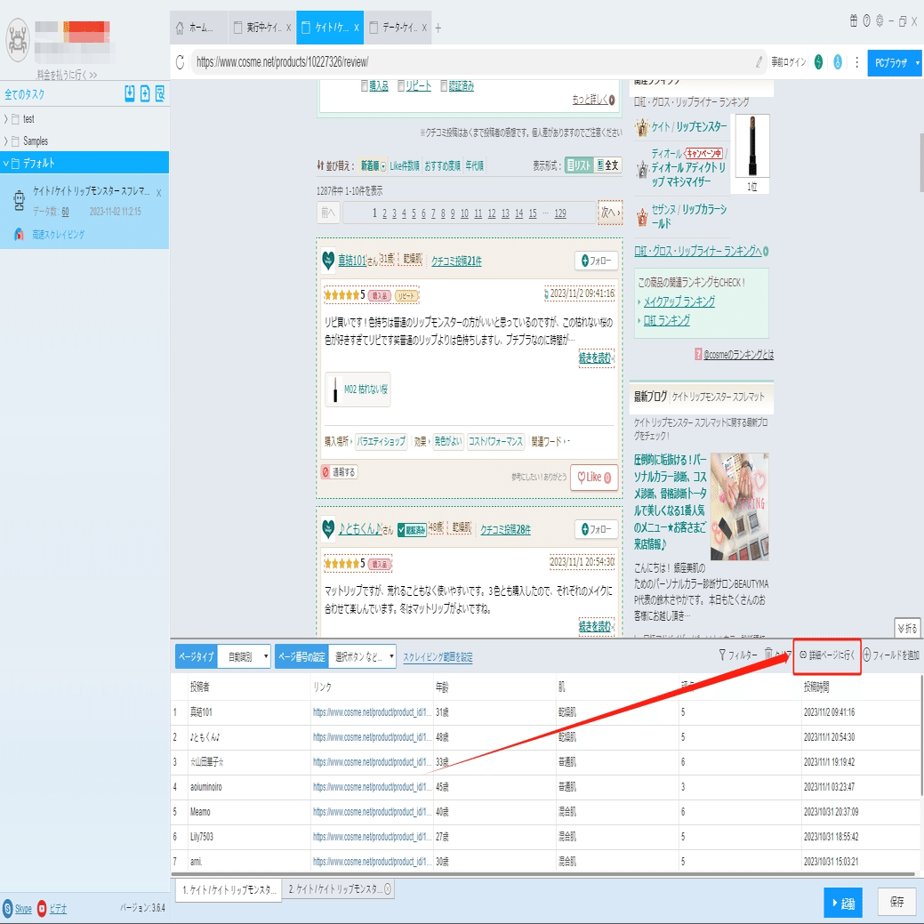 「詳細ページに行く」ボタンをクリックして、レビューページに移動し、クチコミ全文を抽出できます。