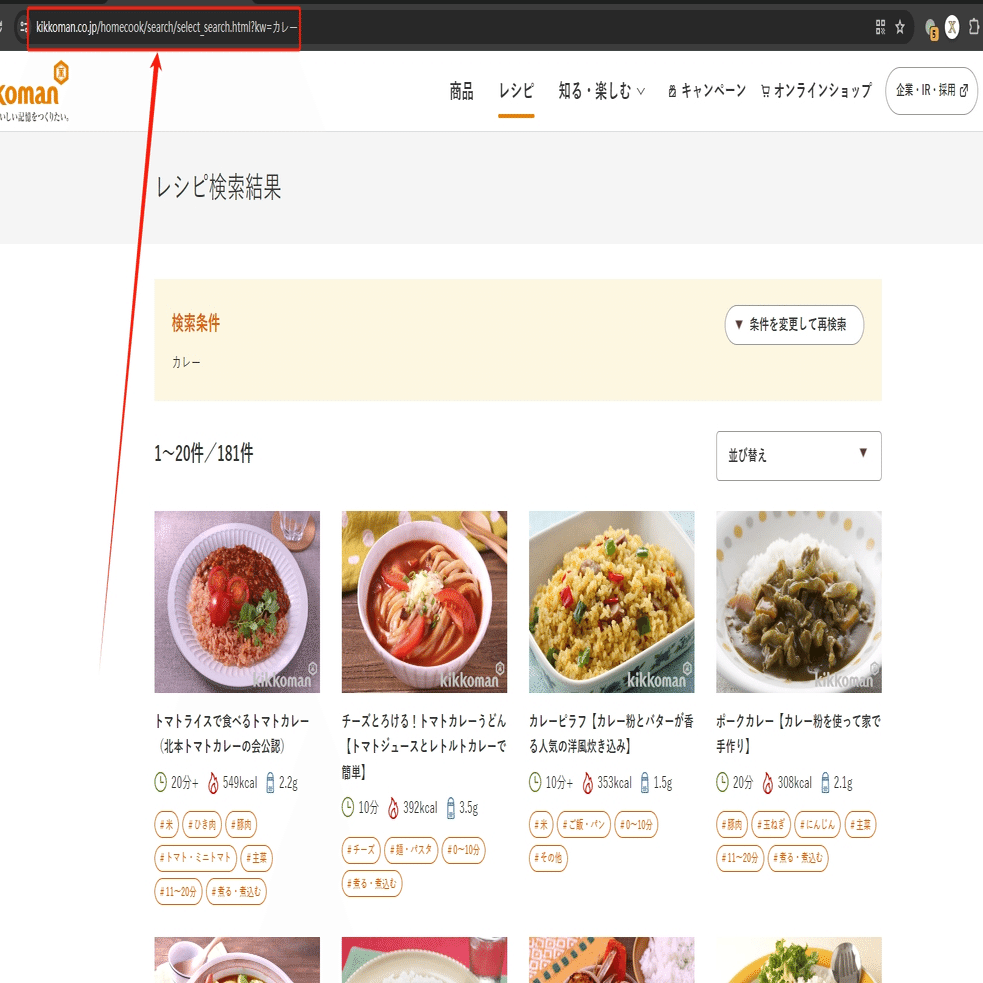 今回はカレーをキーワードとして、その検索結果一覧ページを例として、スクレイピング方法を紹介します。まず、URLをコピーしてください。