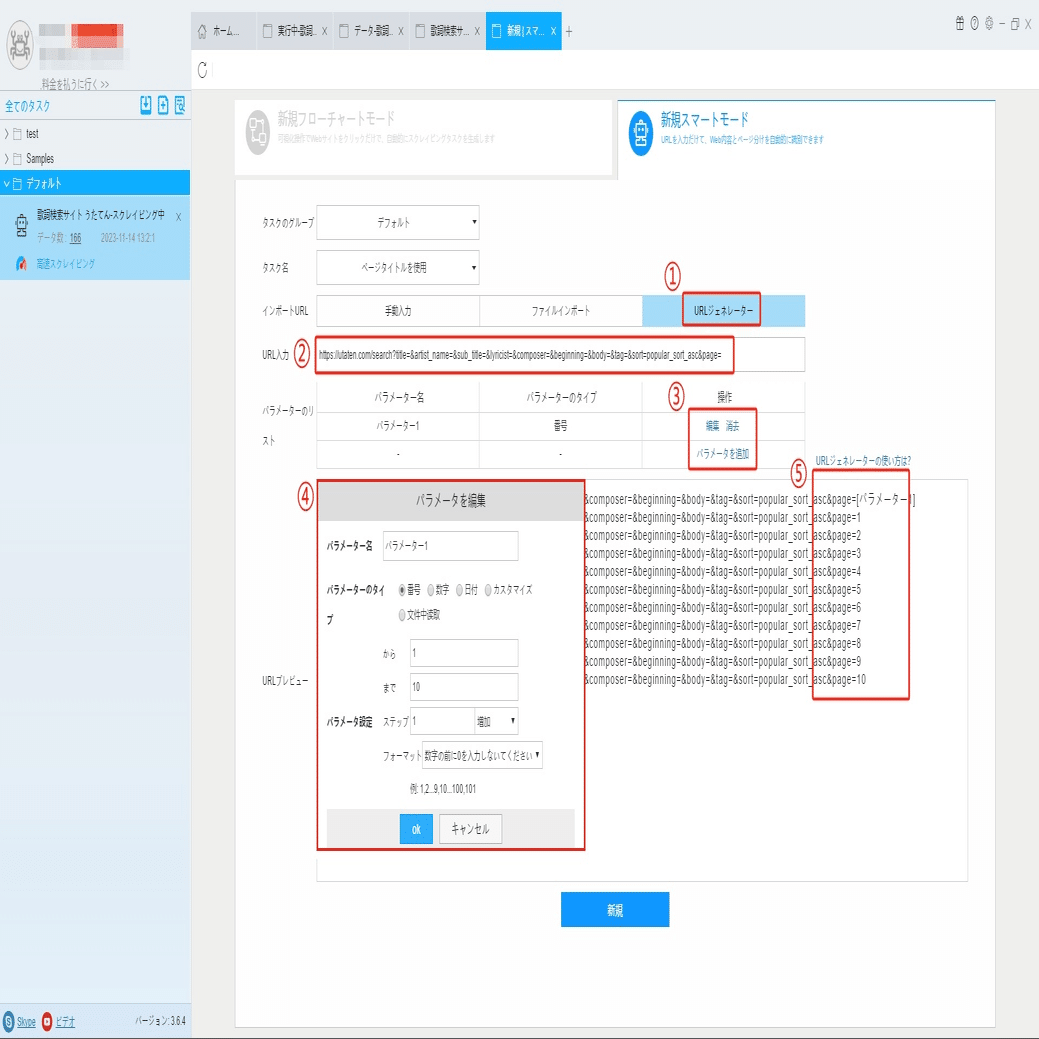 URLジェネレータでURLを入力して、パラメーターを追加画面にページ数を入力します。今回は1から10まで、ステップは1に設定してください。生成したURLはプレビュー画面でチェックしてください。