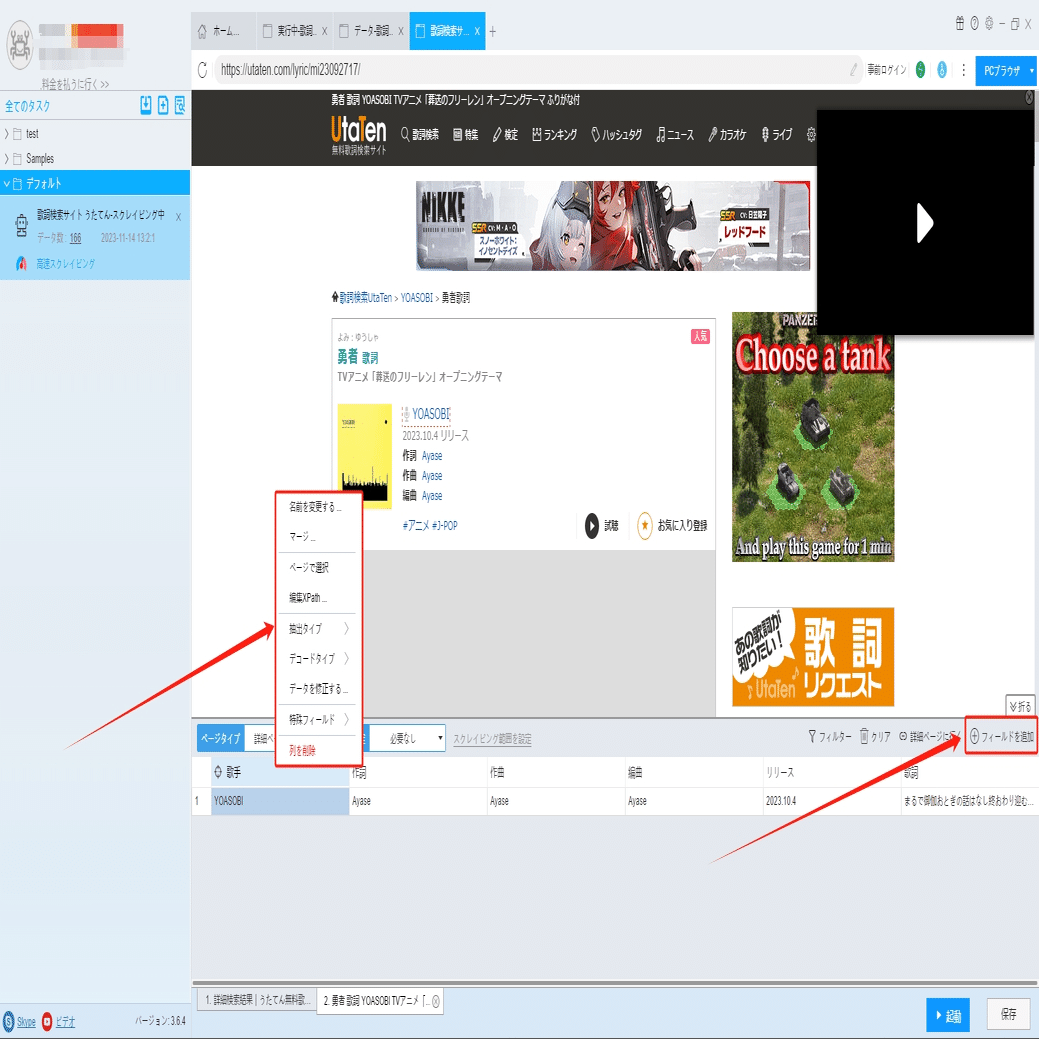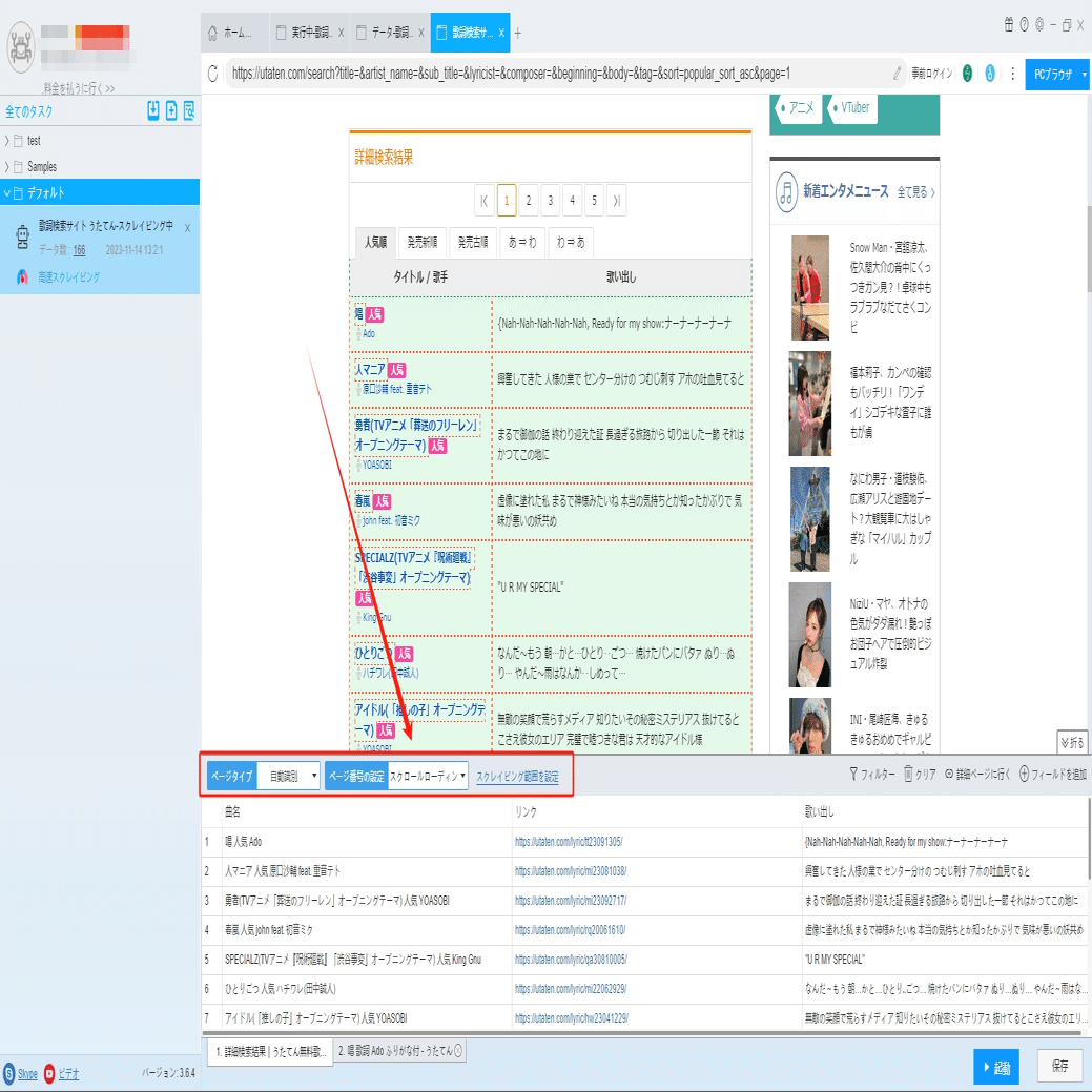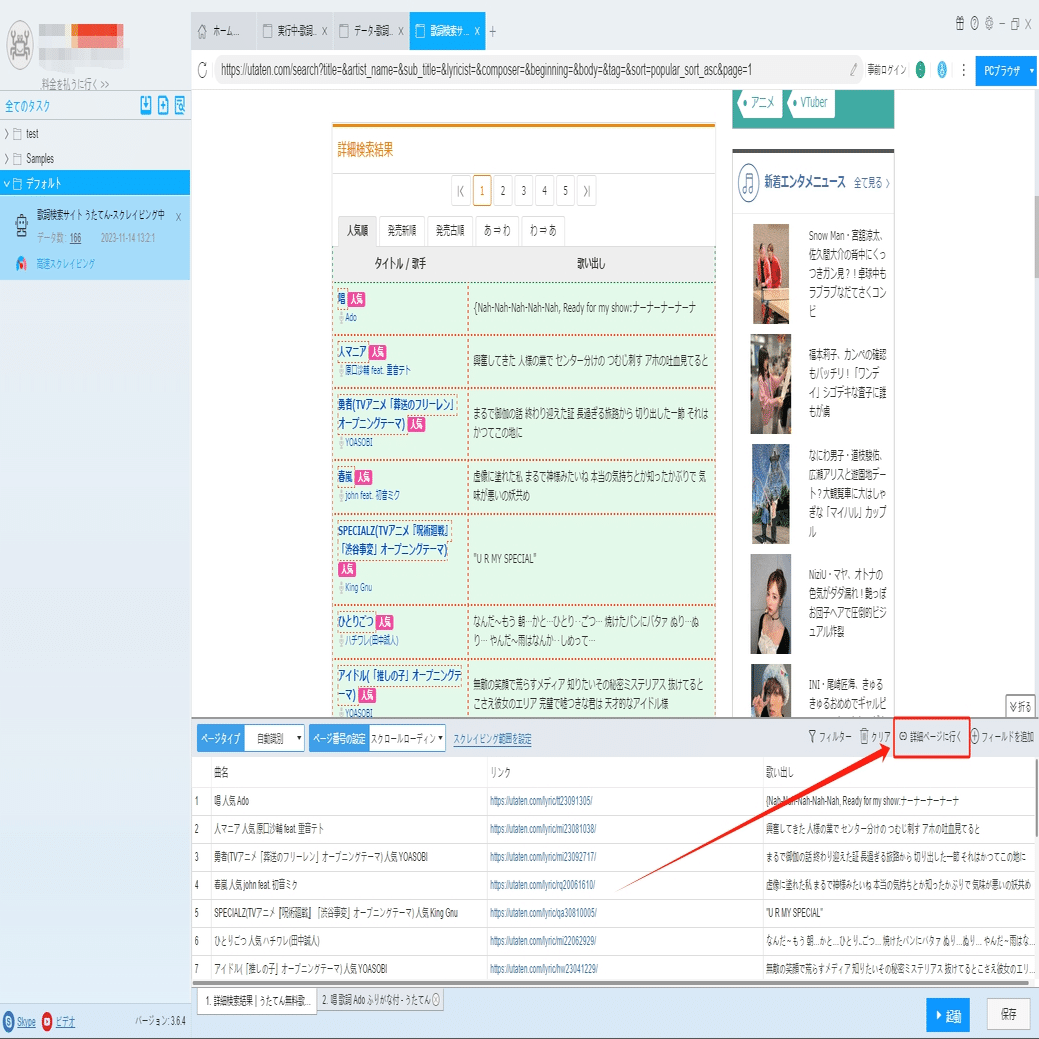 歌詞は詳細ページに付いていますから、ソフトウェアの「詳細ページに行く」機能を利用して、データを抽出します。
