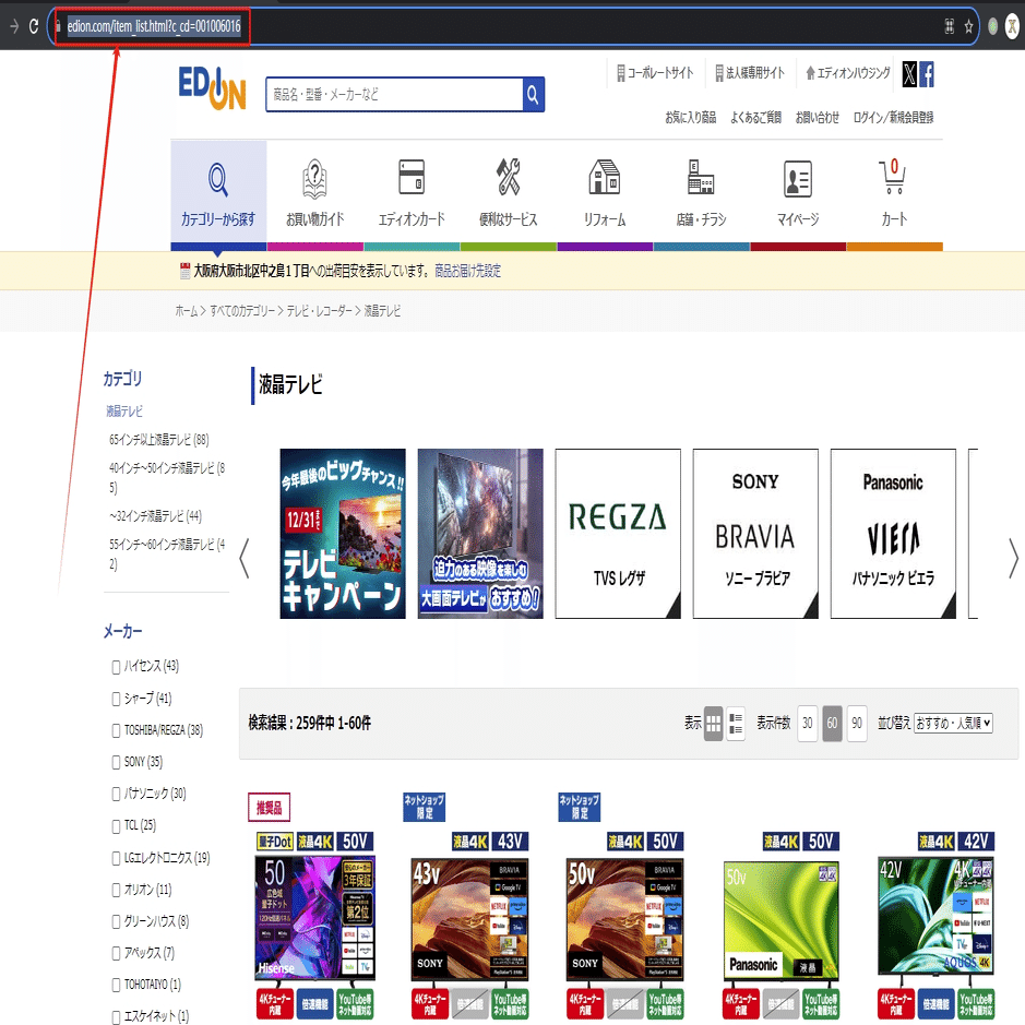 今回は液晶テレビの検索結果一覧ページを例として、そのスクレイピング方法を紹介します。まず、URLをコピーしてください。