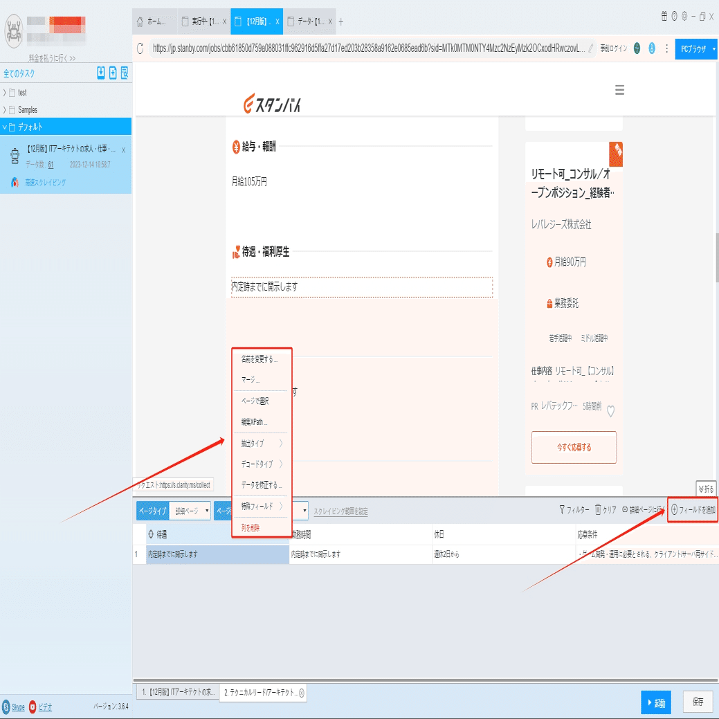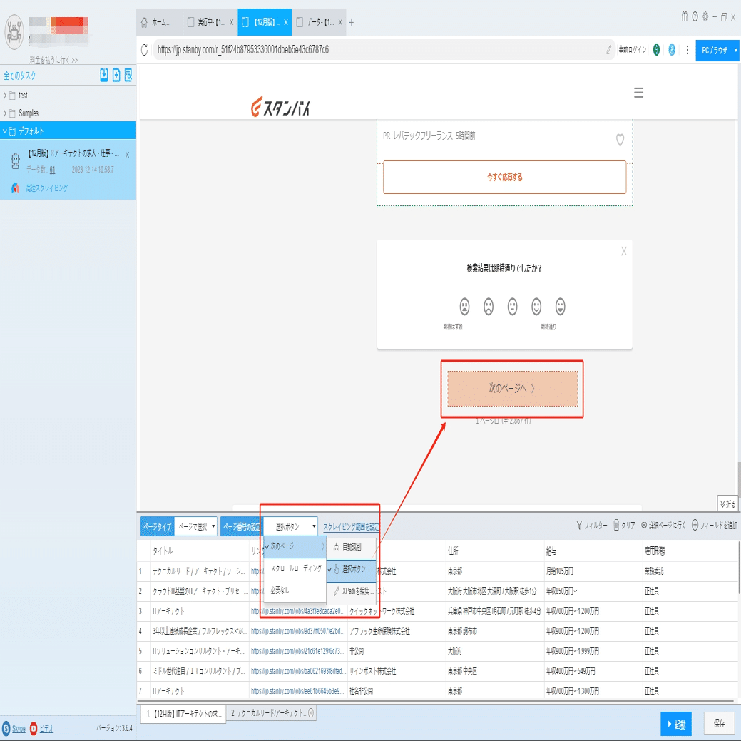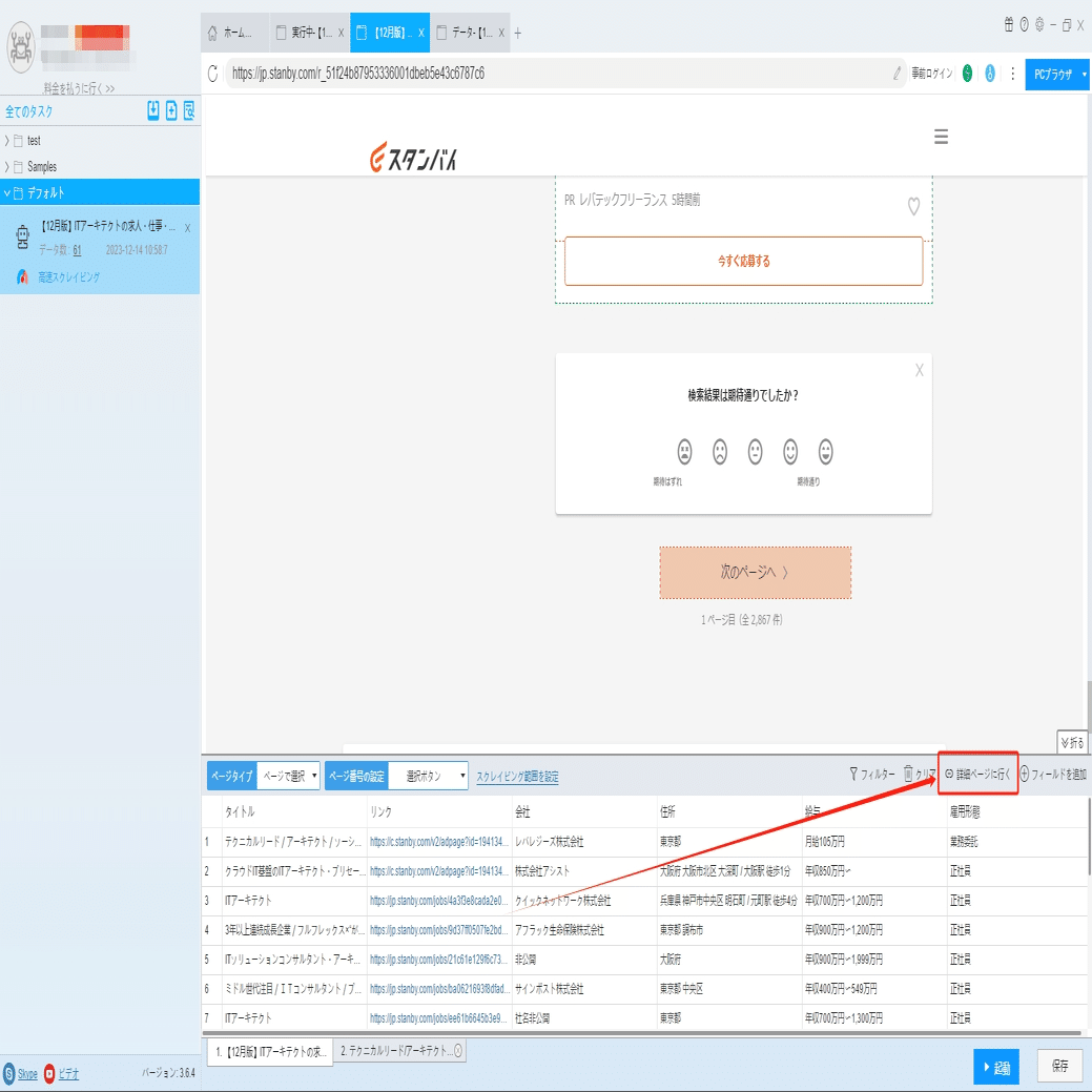 ソフトウェアの「詳細ページに行く」機能を利用し、待遇、休日、勤務時間などの情報を抽出します。