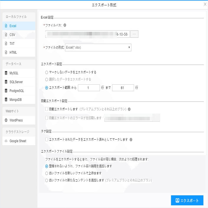 ScrapeStormは、Excel、csv、html、txt、データベース、ローカルなどさまざまなエクスポート方法を提供します。抽出結果のエクスポート方法の詳細には下記のチュートリアルをご参照ください。