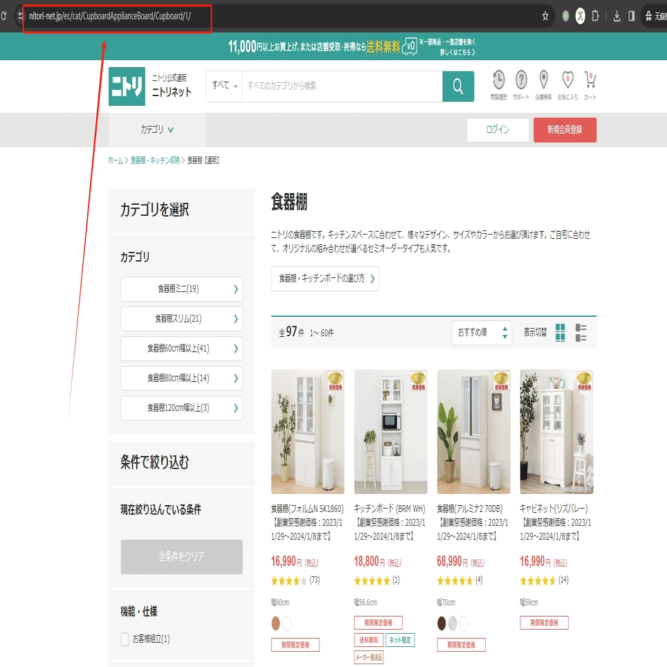 今回は食器棚の検索結果一覧ページを例として、そのスクレイピング方法を紹介します。まず、URLをコピーしてください。
