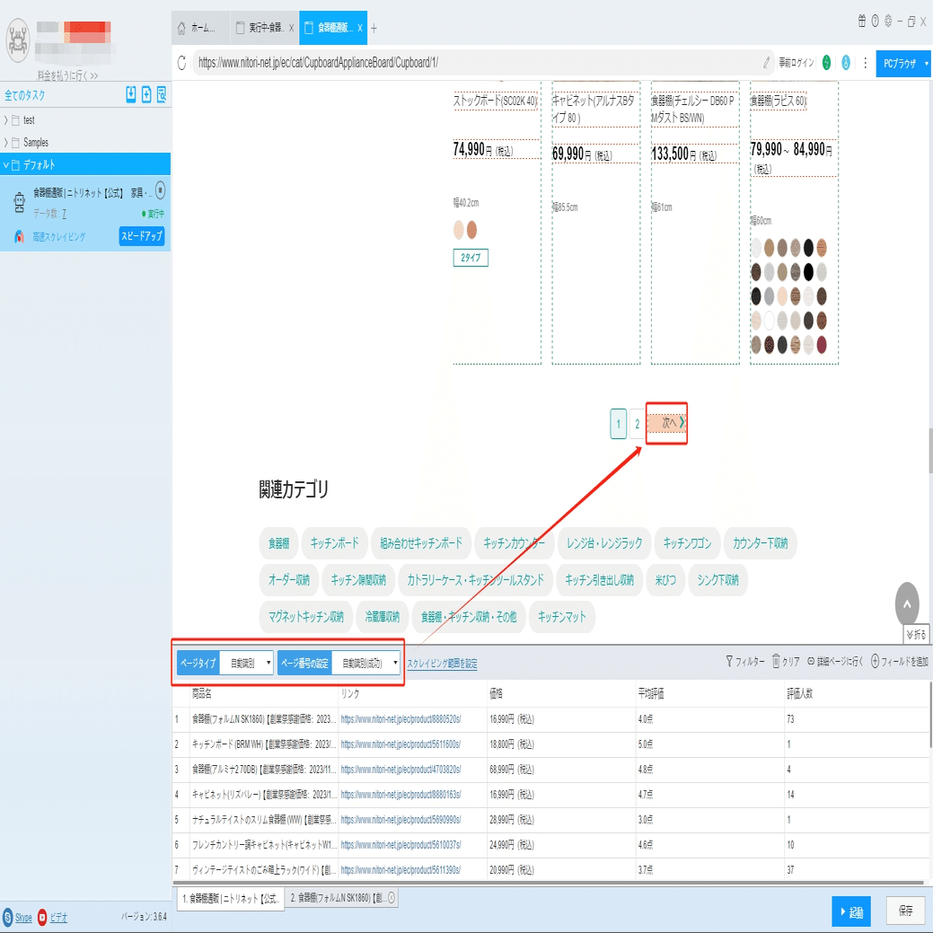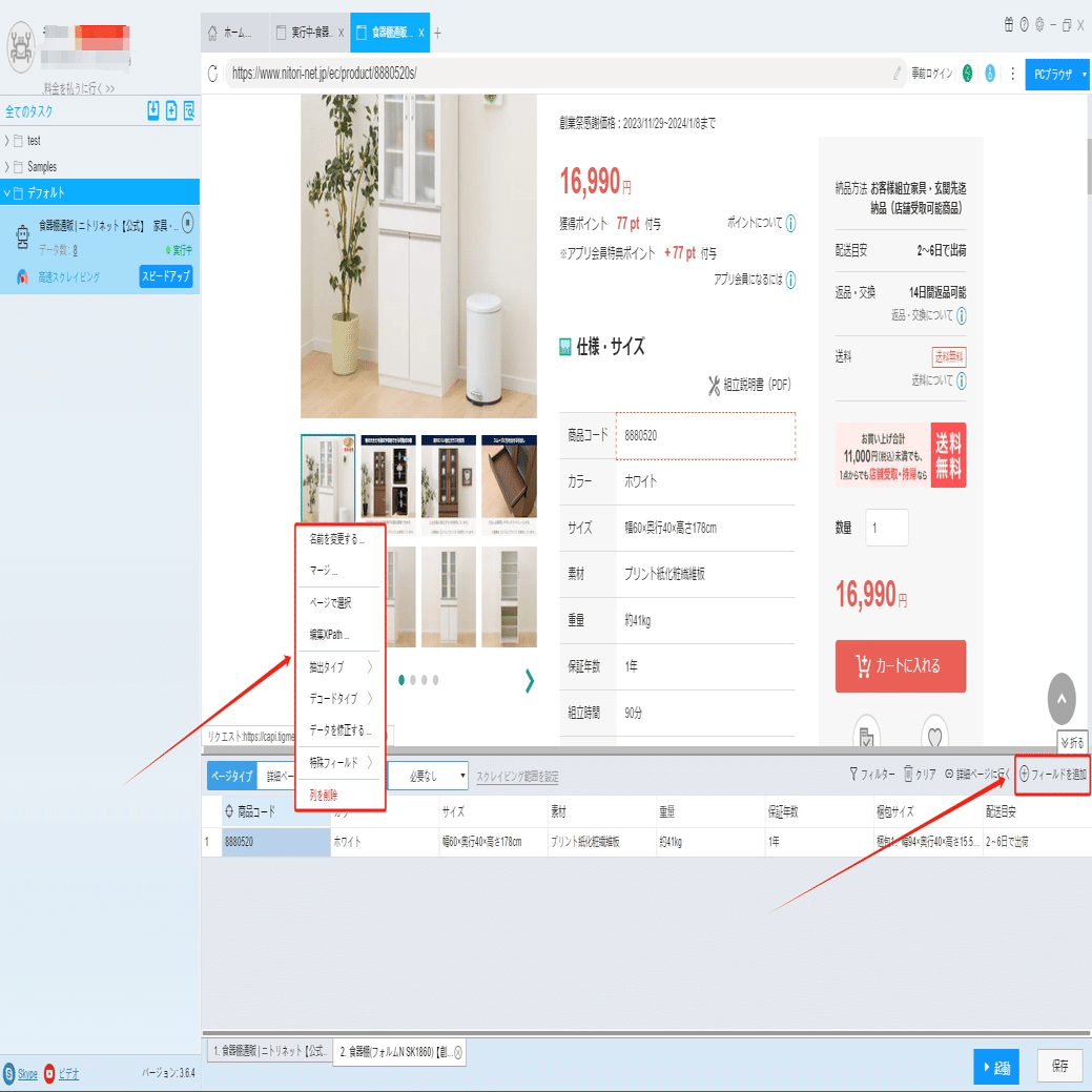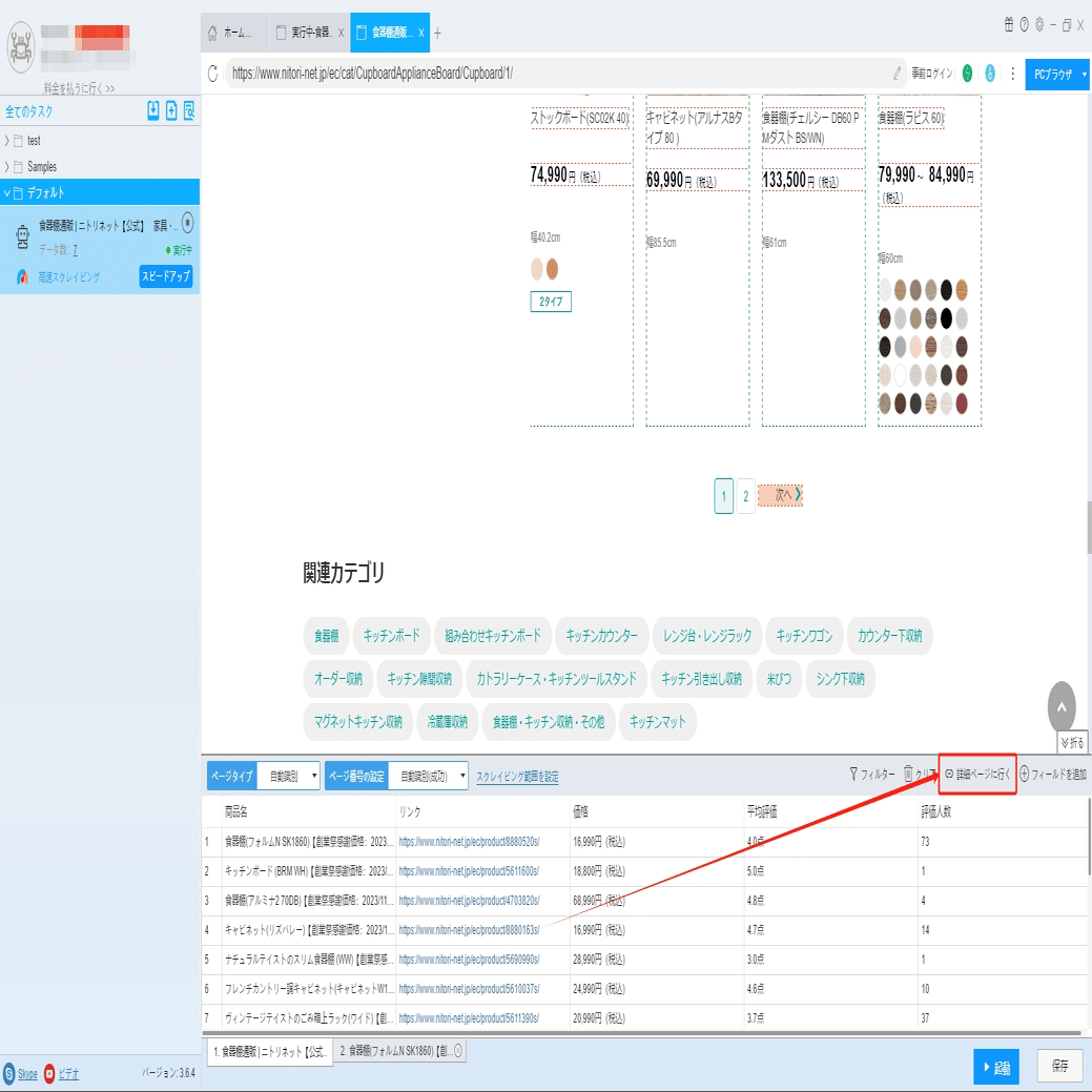 ソフトウェアの「詳細ページに行く」機能を利用し、商品コード、カラー、サイズ、素材などの情報を抽出します。