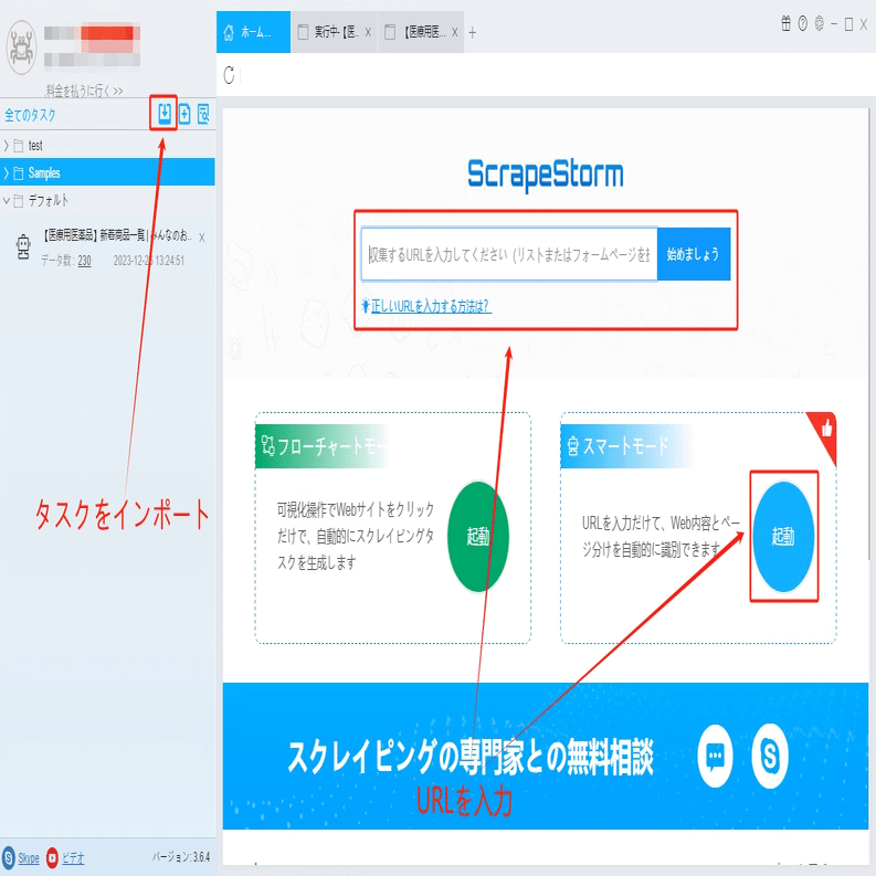 ScrapeStormのホムページ画面にスマートモードタスクを新規作成します。また、持っているタスクをインポートすることもできます。