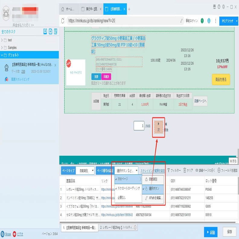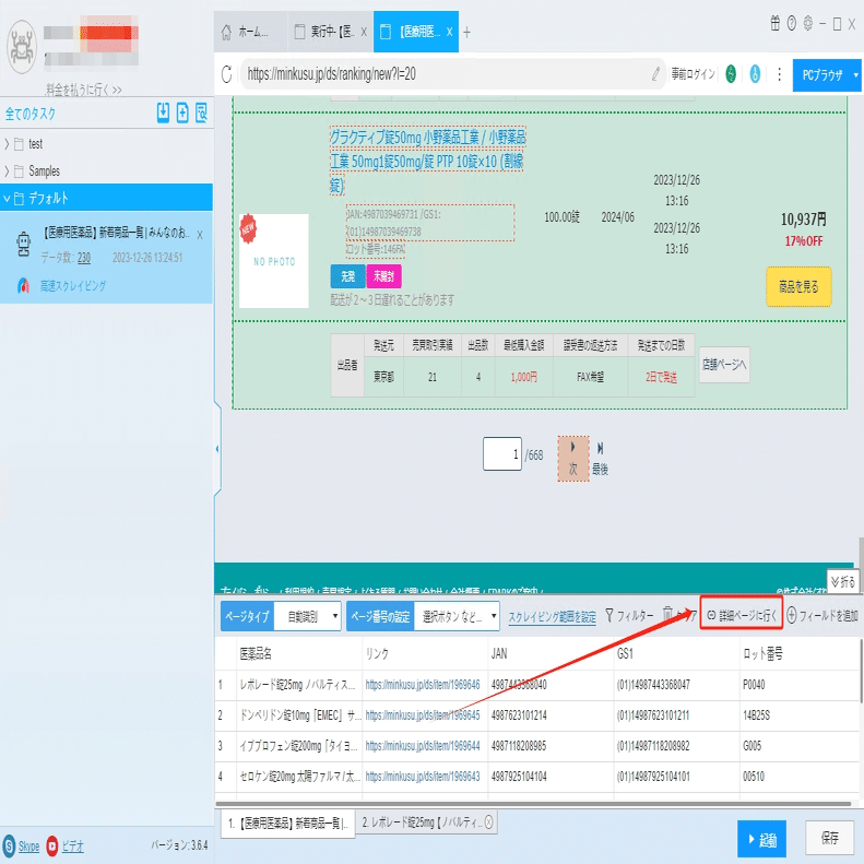 ソフトウェアの「詳細ページに行く」機能を利用し、数量、規格、使用期限などの情報を抽出します。