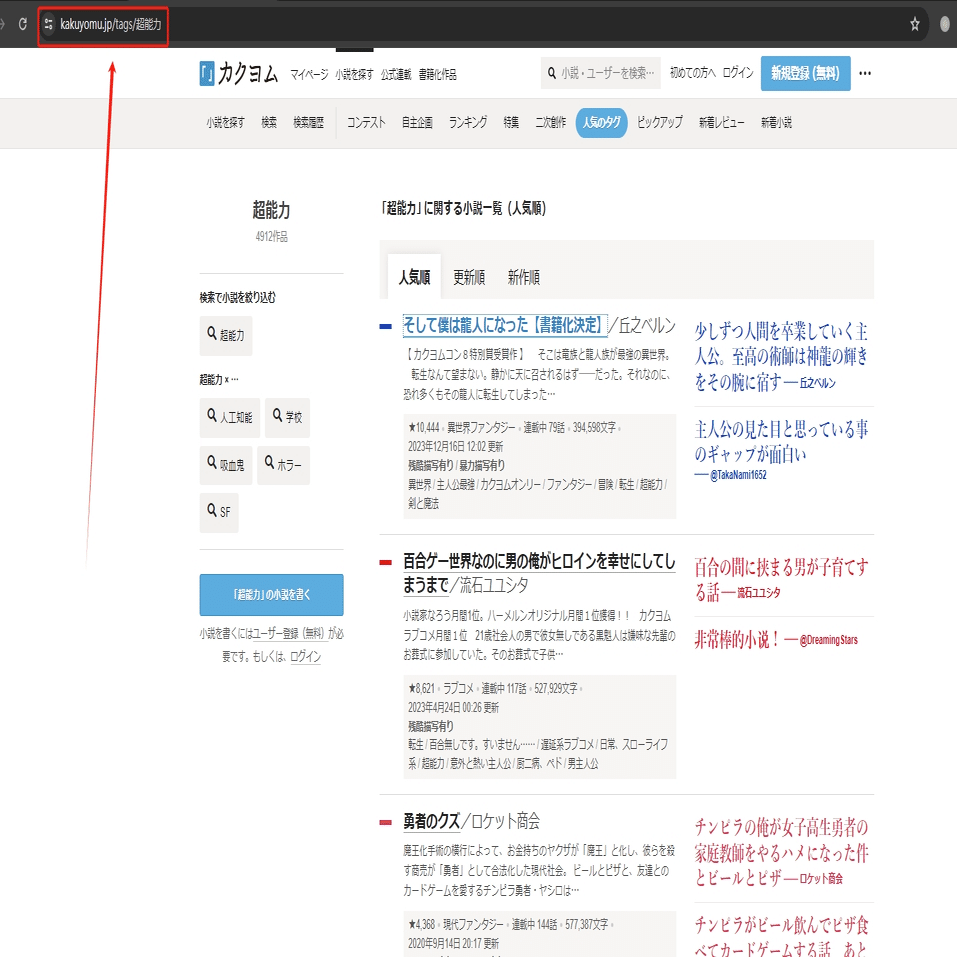 今回は「超能力」に関する小説一覧(人気順)ページを例として、そのスクレイピング方法を紹介します。まず、URLをコピーしてください。