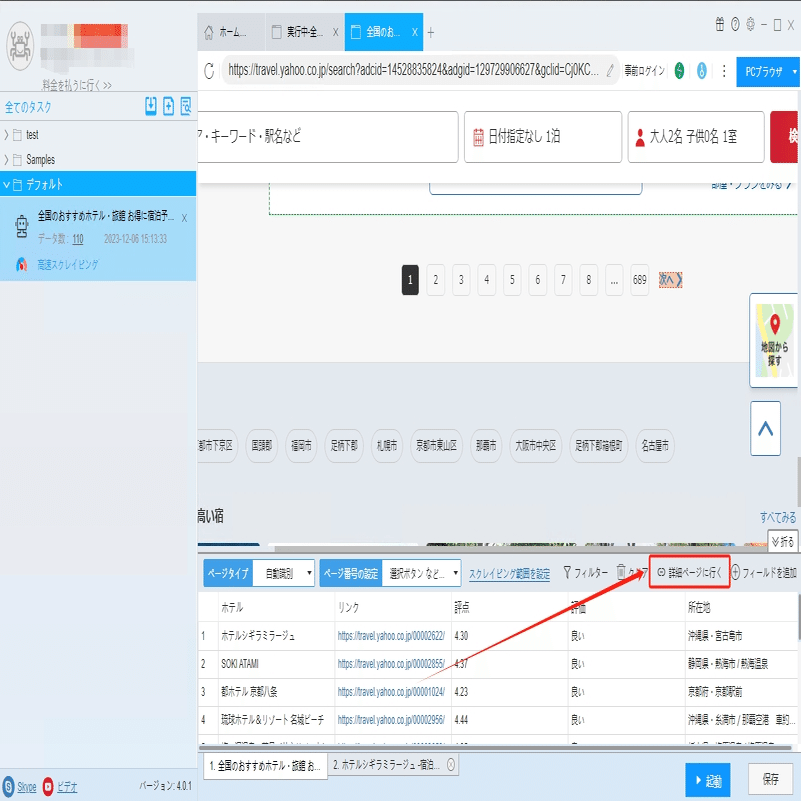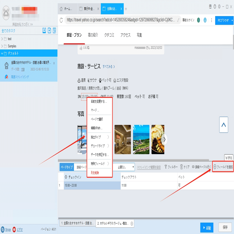ソフトウェアの「詳細ページに行く」機能を利用し、チェックイン、チェックアウト、ペットなどの情報を抽出します。