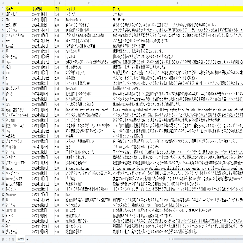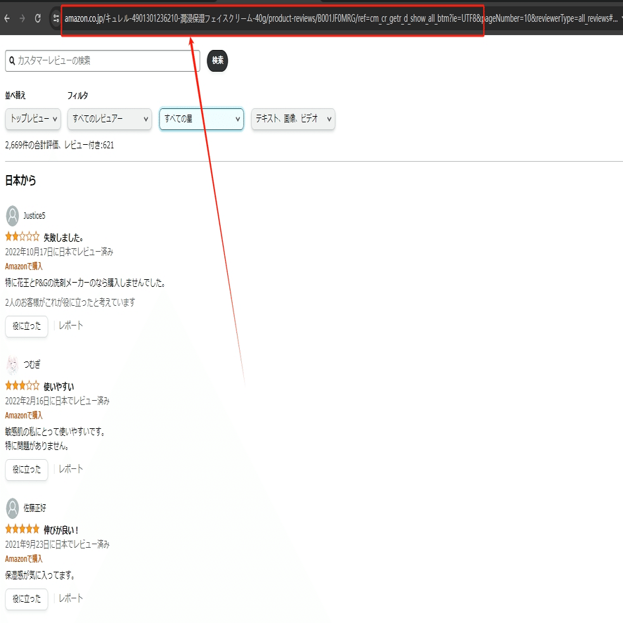 今回はある人気化粧品のレビューページを例として、そのスクレイピング方法を紹介します。まず、URLをコピーしてください。