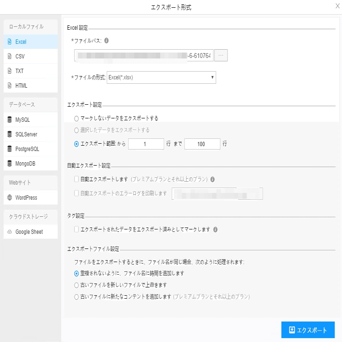 ScrapeStormは、Excel、csv、html、txt、データベース、ローカルなどさまざまなエクスポート方法を提供します。抽出結果のエクスポート方法の詳細には下記のチュートリアルをご参照ください。