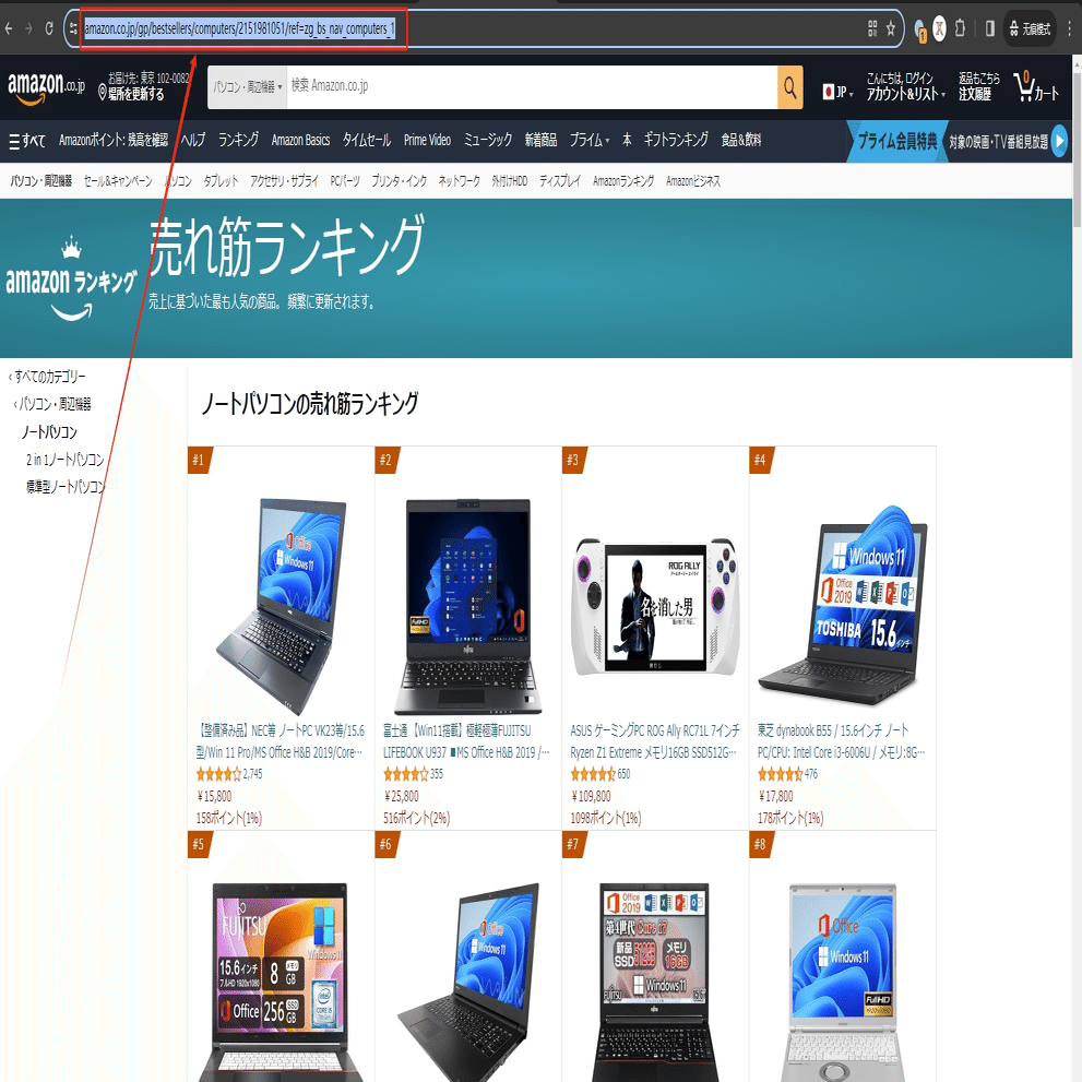 今回はノートパソコンの売れ筋ランキングページを例として、そのスクレイピング方法を紹介します。まず、URLをコピーしてください。