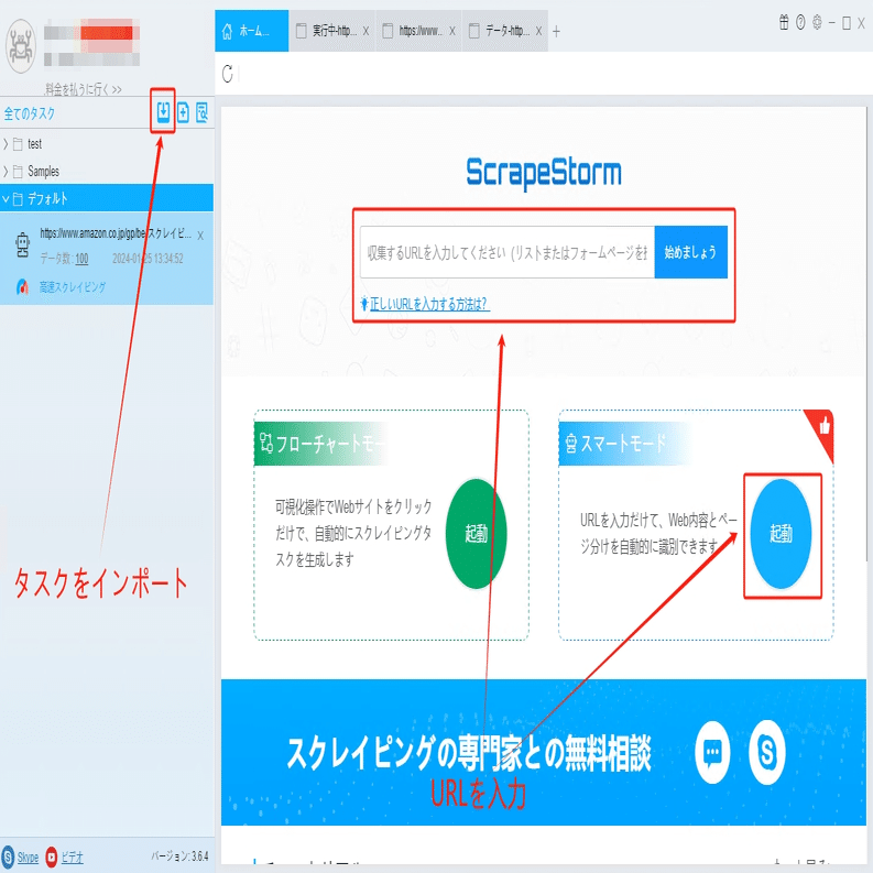 ScrapeStormのホムページ画面にスマートモードタスクを新規作成します。また、持っているタスクをインポートすることもできます。
