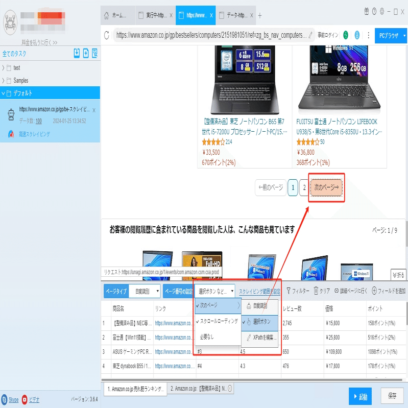 ScrapeStormは自動的にリスト要素とページボタンを識別できます。偶に誤差があれば、手動で選択してください。下記のチュートリアルも参照してください。