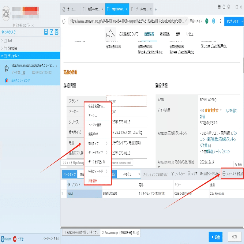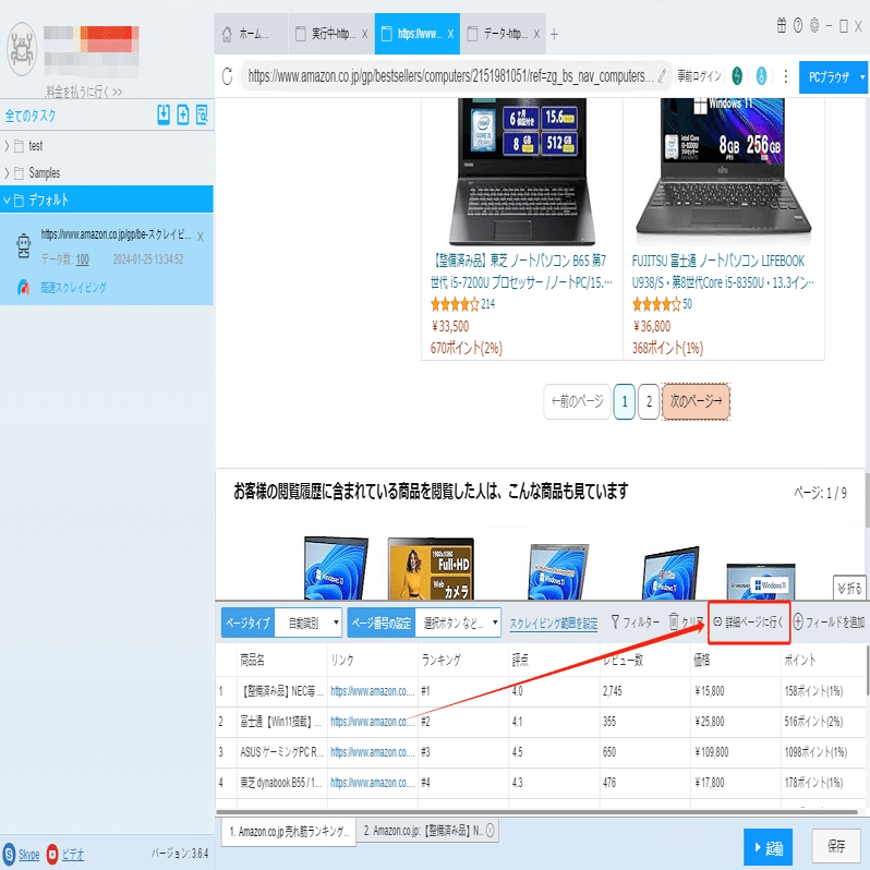 ソフトウェアの「詳細ページに行く」機能を利用し、ASIN、ブランド商品の詳細などの情報を抽出します。