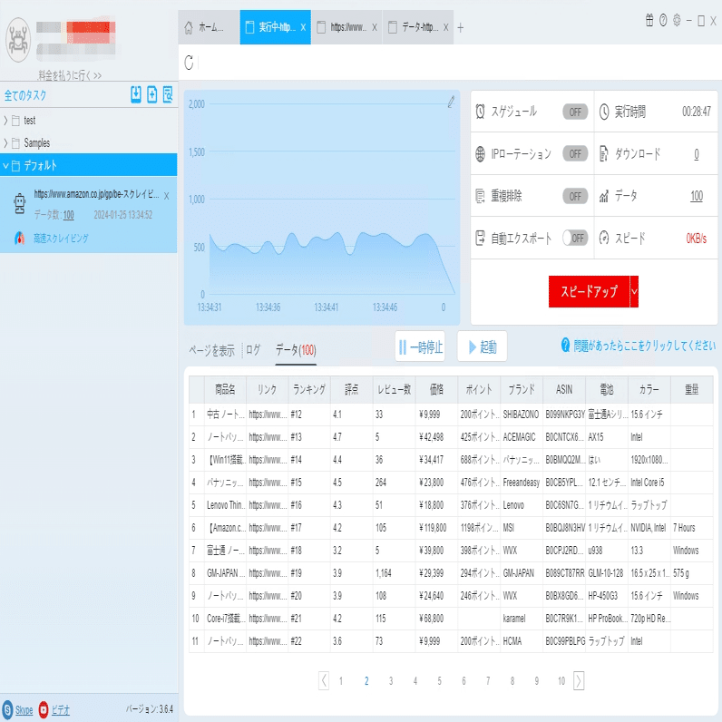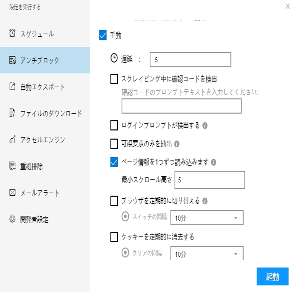 必要に応じて、スケジュール、アンチブロック、自動エクスポート、写真のダウンロード、スピードブーストを設定できます。サーバーに負荷しないように、遅延時間を設定してください。5秒以上を推薦します。スクレイピングタスクを配置する方法については、下記のチュートリアルをご参照ください。