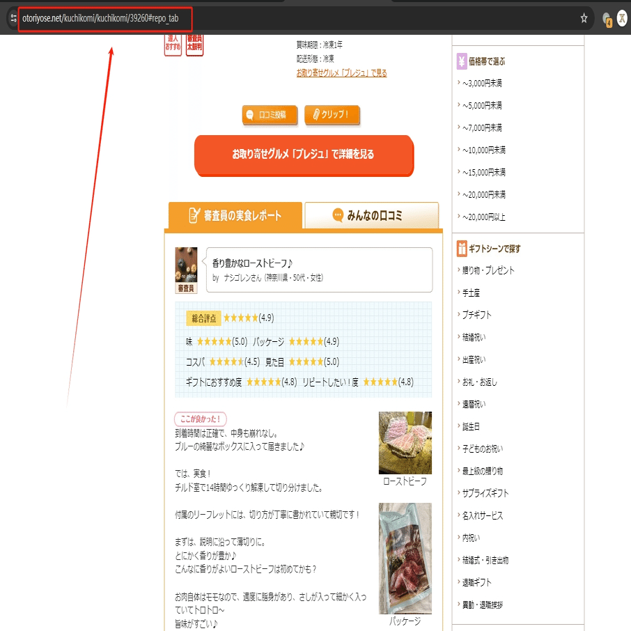 今回はある人気特産品のレポートを例として、そのスクレイピング方法を紹介します。まず、URLをコピーしてください。