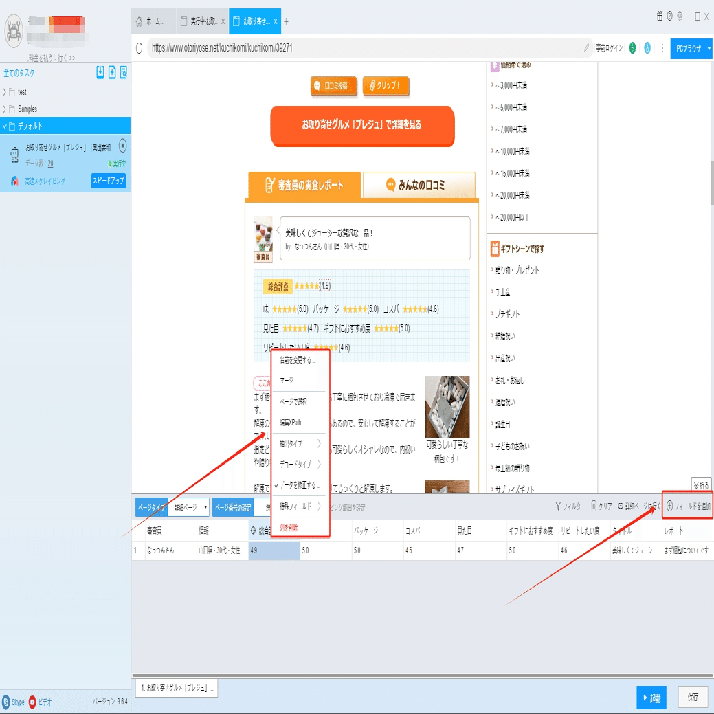 「フィールドを追加」ボタンをクリックして、画面に必要な要素を選択、データが自動的に抽出されます。また、必要に応じてフィールドの名前の変更または削除、結合できます。