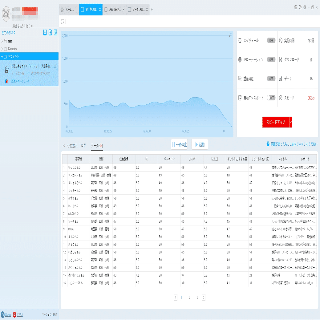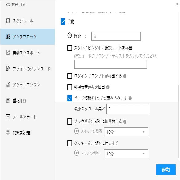 必要に応じて、スケジュール、アンチブロック、自動エクスポート、写真のダウンロード、スピードブーストを設定できます。サーバーに負荷しないように、遅延時間を設定してください。5秒以上を推薦します。スクレイピングタスクを配置する方法については、下記のチュートリアルをご参照ください。