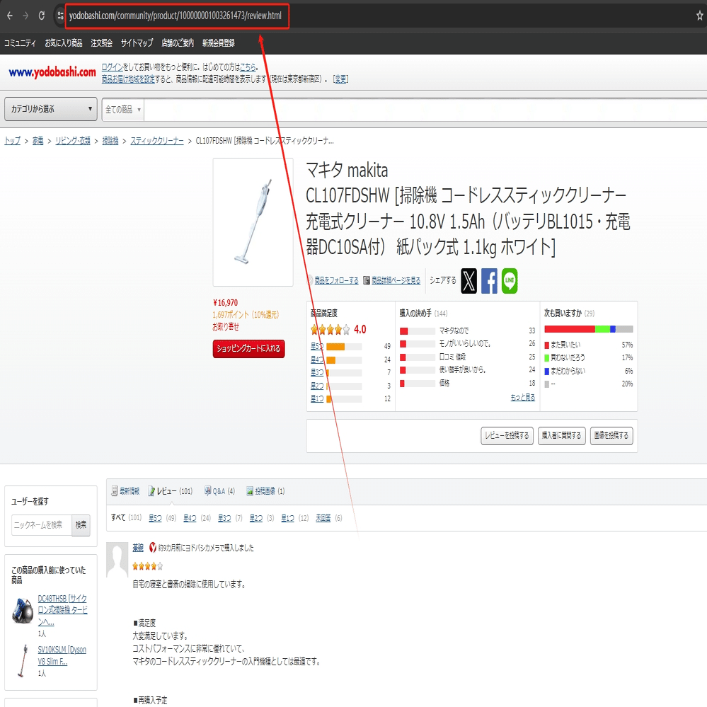 今回はある人気商品のレビューページを例として、そのスクレイピング方法を紹介します。まず、URLをコピーしてください。